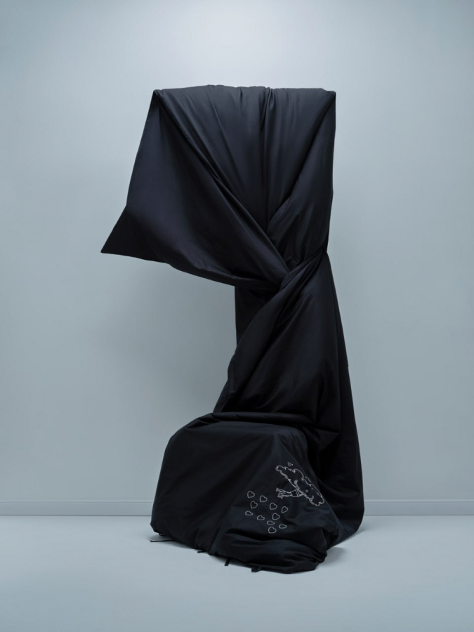 В набор вошли шорты, топ-бандо и постельное бельё, а также ароматические спреи. Все эти вещи креаторы преподнесли как элементы перформанса, которые могли бы использовать художники-перформансисты.