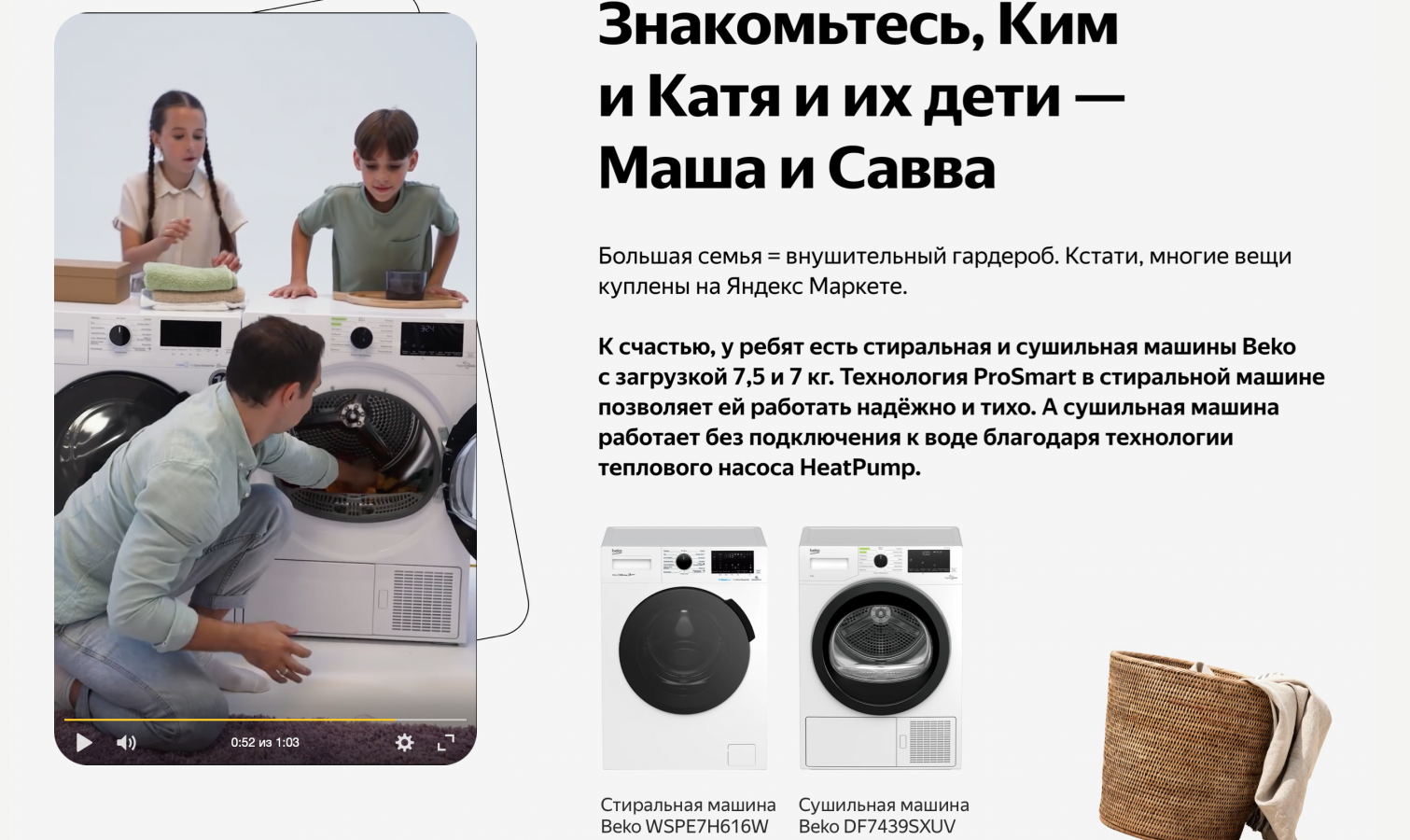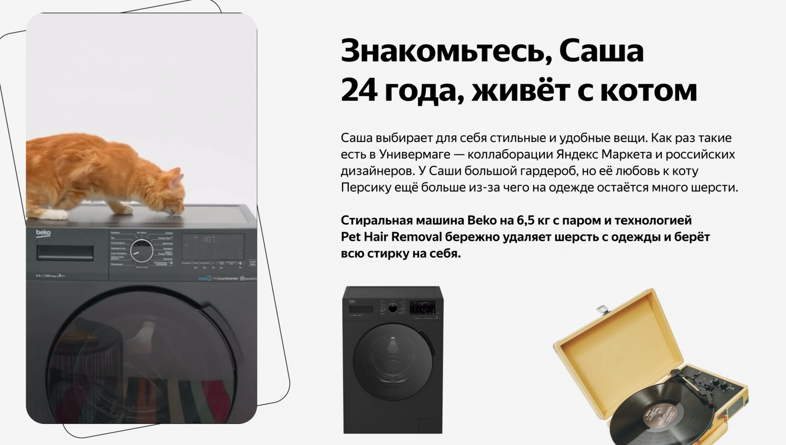 На площадке маркетплейса «Маркет» и Beko запустили проект про объединение привычного каждому человеку стиля жизни и, вместе с ним, комфорта. Большой гардероб, шерсть любимого питомца на любимом свитере из ЦУМ, пополнение в семье или объемная семейная стирка — всё это совсем не проблема для стиральных машин Beko, считают авторы проекта.