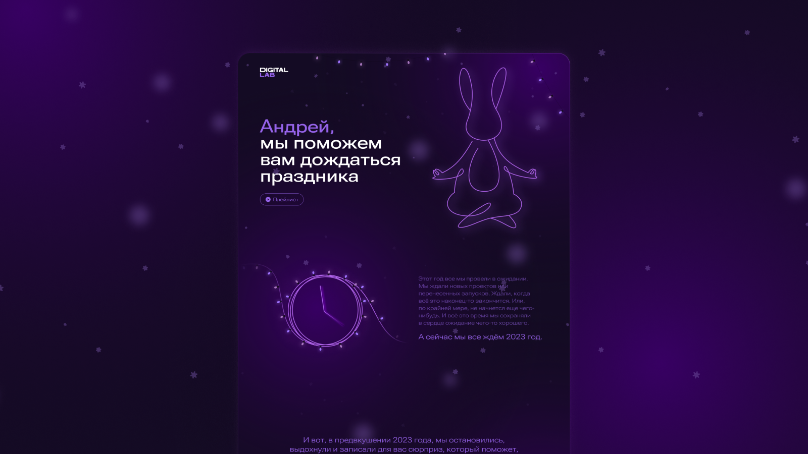 Проект «Пока ты ждёшь…» стал новогодним сюрпризом от группы компании Digital Lab. Идея проекта в его названии, ведь прошлый год был полон самых разных ожиданий, а в декабре мы все ждали скорейшего наступления Нового года. Приблизить его было невозможно, зато сделать ожидание приятнее — реально.
