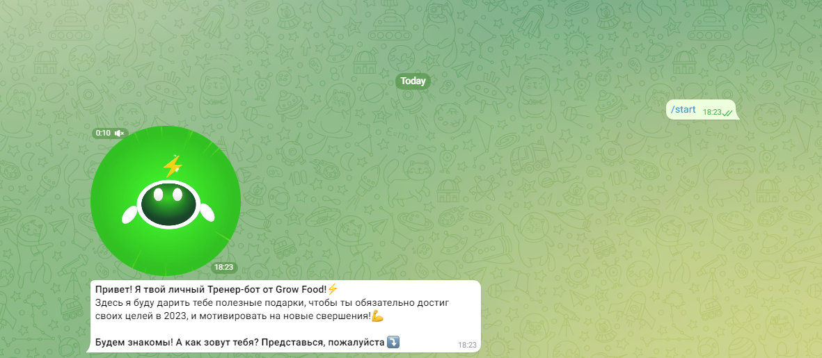 Сервис доставки готового питания Grow Food запустил тренер-бота, который вдохновляет подписчиков на новые свершения. До 22 января пользователи бота могли получить полезные лекции, мотивирующие задания, подарки и приятные скидки от бренда и партнеров.
