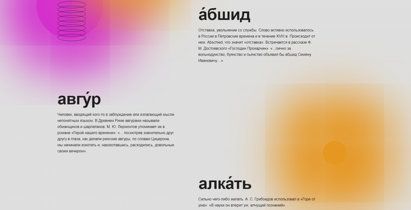 Суть проекта «Музей слов» в том, чтобы создать онлайн-пространство для устаревающих, редко употребляемых или совсем не используемых слов, и рассказать их истории, так как каждое слово когда-то было частью жизни пользователей.