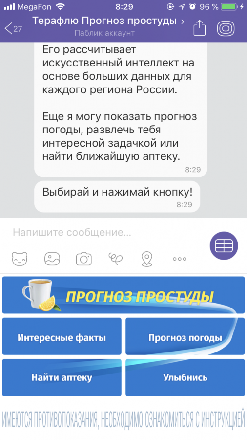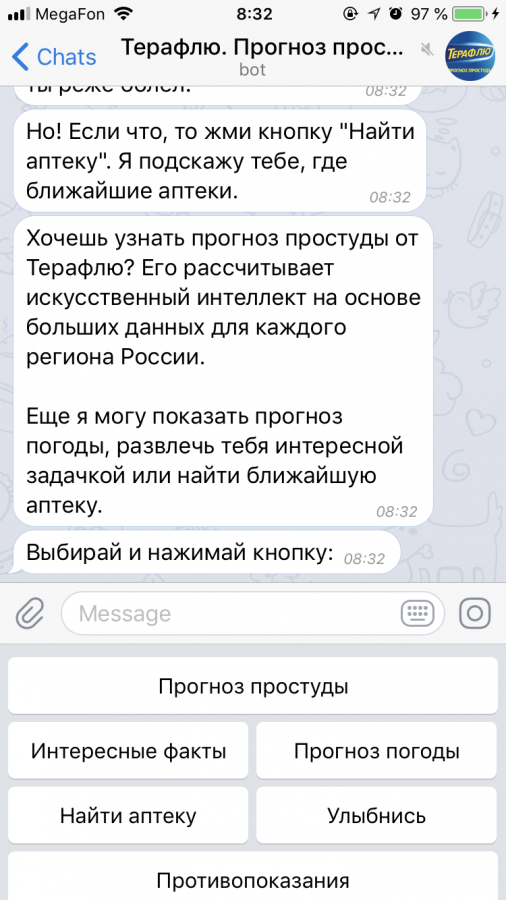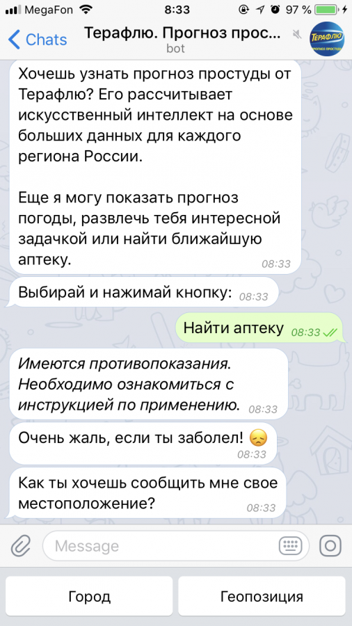 SocialCraft . Помимо основной функции отправки оповещений об уровне распространения простуды, бот сообщает прогноз погоды, ищет ближайшие аптеки по геолокации, проводит викторины и делится интересными фактами (о простуде, иммунитете и «ТераФлю»).
