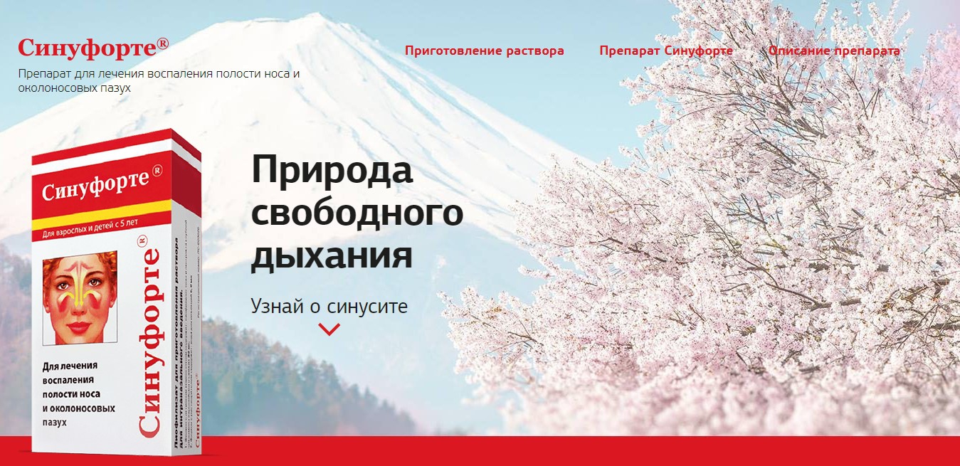 Проект призван повысить знания о синусите, способах его самодиагностики и преимуществах назального спрея «Синуфорте». В качестве основного канала коммуникации с ЦА выступает промосайт, где можно получить информацию о лекарственном средстве и найти ответы на волнующие вопросы.