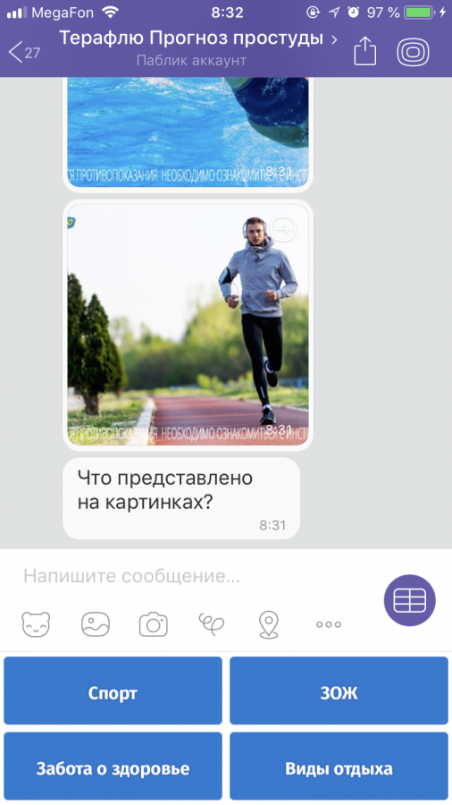 Мы понимали, что для потребителей сегодня недостаточно мобильной версии сайта, и с самого старта проекта обсуждали, откуда люди будут получать информацию о «Прогнозе простуды». Обширные дебаты шли вокруг создания собственного приложения, но данные показали, что на этапе запуска будет крайне сложно подтолкнуть пользователей к его установке. А нам при этом хотелось иметь возможность общаться с нашей аудиторией чаще, ведь «Прогноз простуды» — это сервис, который интересен каждый день. Мессенджеры стали идеальным решением. Комбинация Viber плюс Telegram оказалась оптимальной по оценке охвата и технической простоты решения.
