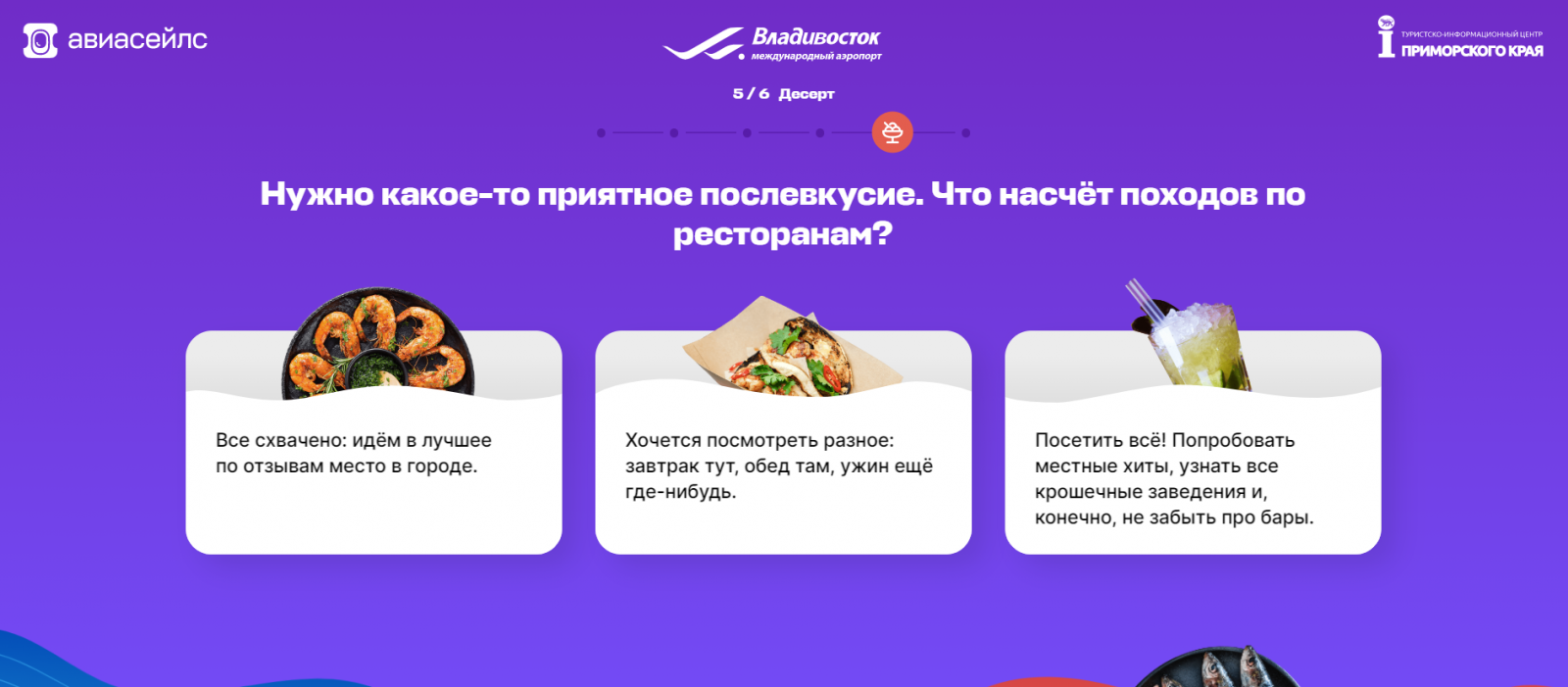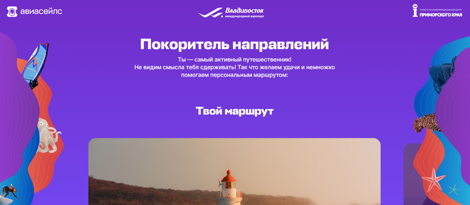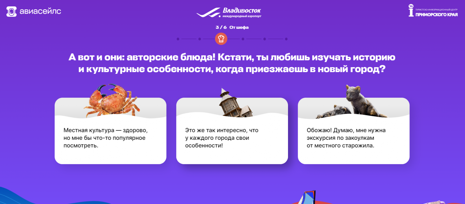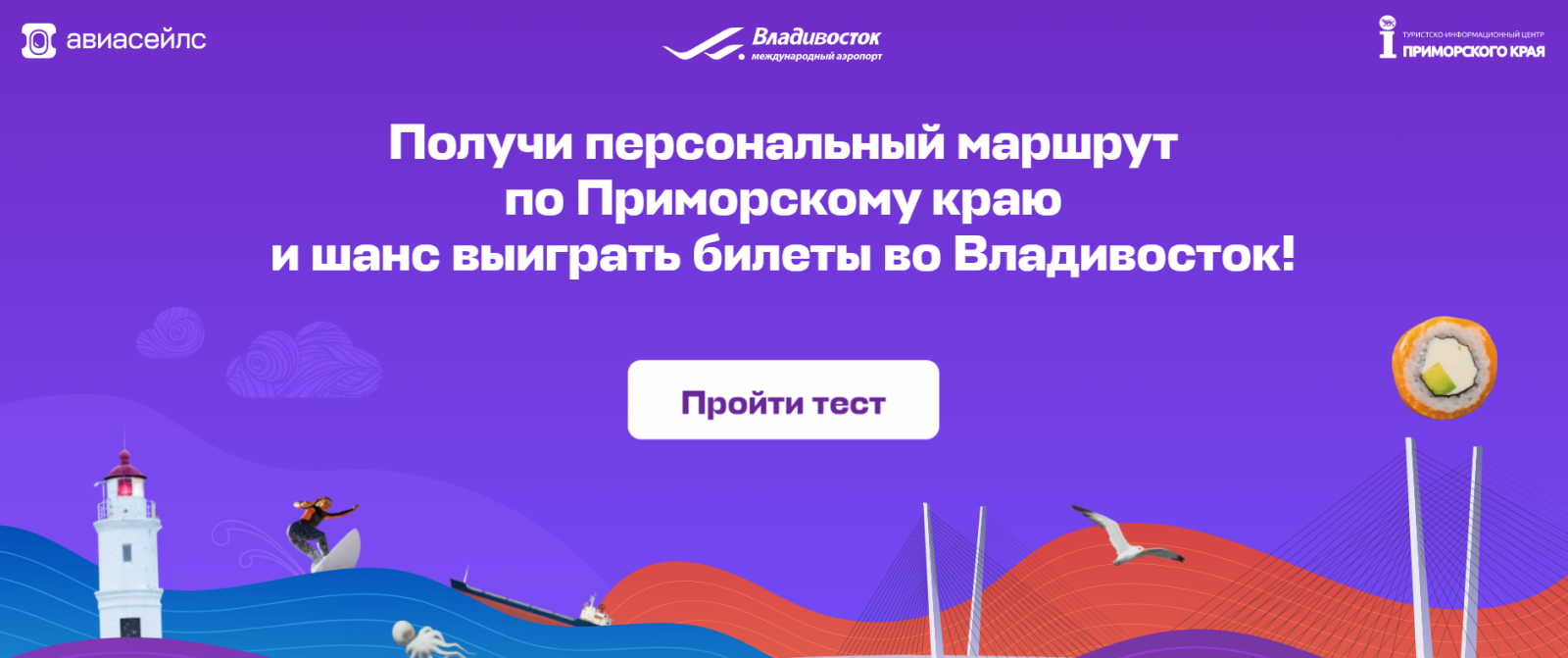 «Авиасейлс» совместно с Международным аэропортом Владивостока разработали активацию для привлечения в регион российских туристов. Ее участники могли выиграть авиабилеты в столицу Дальнего Востока — для этого им нужно было пройти тест из шести вопросов. После этого пользователь получал персональный маршрут по Приморскому краю и шанс на победу.