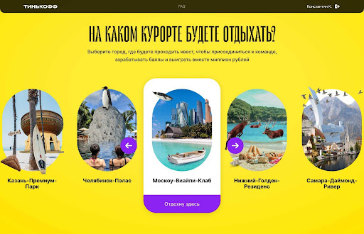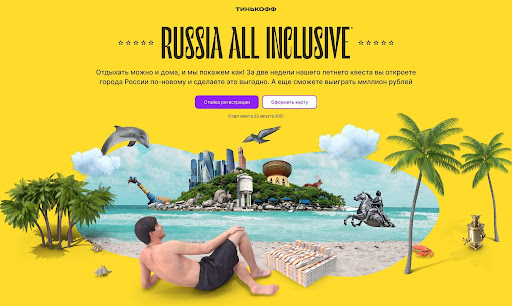 «Тинькофф» представил проект «Россия all Inclusive» — квест направлен на развитие интереса жителей России к внутреннему туризму. 23 августа после регистрации на сайте активации пользователи могли выбрать город из списка и приступить к выполнению заданий — например, отправиться на шоппинг с повышенным кэшбэком, ответить в квизах на вопросы про Минеральные Воды или приобрести тревел-страховку с большой скидкой по секретному промокоду. Накопленные баллы помогли участникам побороться за денежный приз в один миллион рублей.