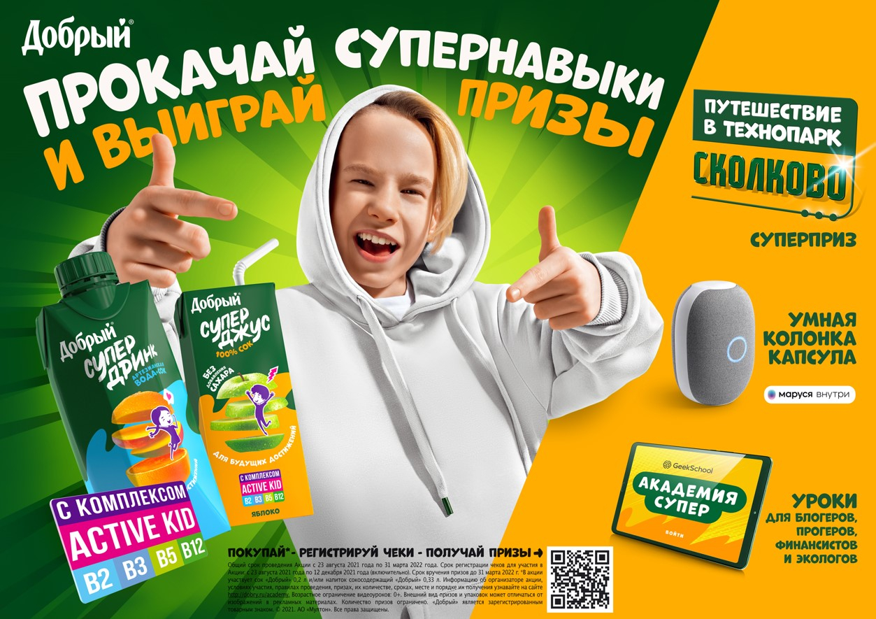Для промо новой линейки «Доброго» были задействованы как охватообразующие каналы, такие как онлайн-видео, баннерные и соцсети. В рамках активации покупатели смогут выиграть умную колонку «Капсула» от Mail.ru Group с голосовым помощником «Марусей» внутри, а также поездку в инновационный технопарк «Сколково» для прохождения эксклюзивного квеста. Участники акции получили доступ к контенту «Академии Супер», а также мерч с дополненной реальностью.