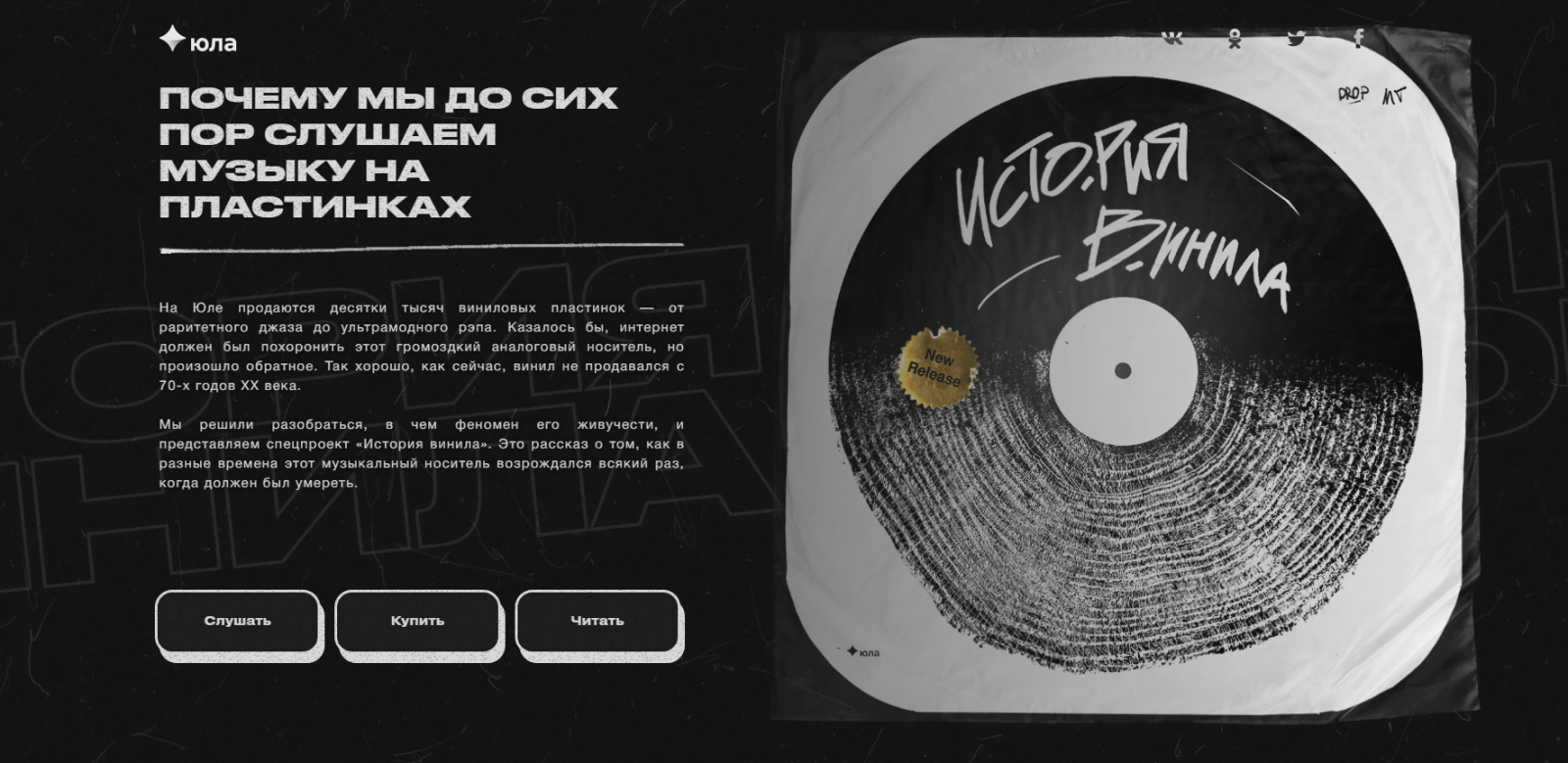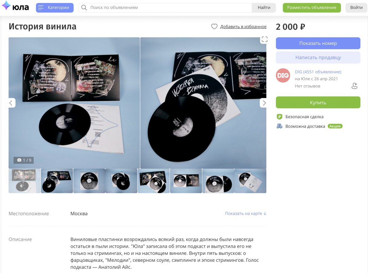 «Винилу постоянно предрекают скорейшую гибель, но он всегда обманывает собственную смерть» — в этом явлении решил разобраться сервис объявлений «Юла». Подкаст «История винила» состоит из пяти выпусков — его голосом стал радиоведущий Анатолий Айс, над сценарием работал виниловый фетишист Андрей Тестов, сводил звук Федор Балашов, дизайнером проекта выступил Аркадий Лапшов, PR был на Артем Коваленко, а продюссер Эмма Барсегова собрала реализацию идеи Владислава Моисеева в единое целое.