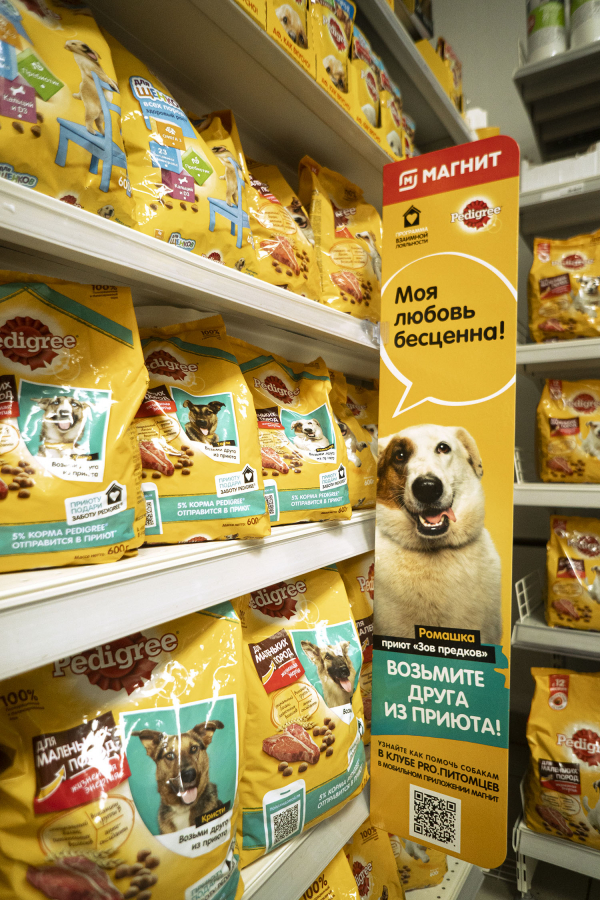 С 29 июля в сети магазинов «Магнит» можно было приобрести корм в специальной упаковке, на которой изображены реальные собаки из приютов. А чтобы как можно больше москвичей узнали о возможности помочь собакам найти новый любящий дом, бренд разместил фотографию приютской собаки Сильвии на 130 автомобилях сервиса Яндекс Go.