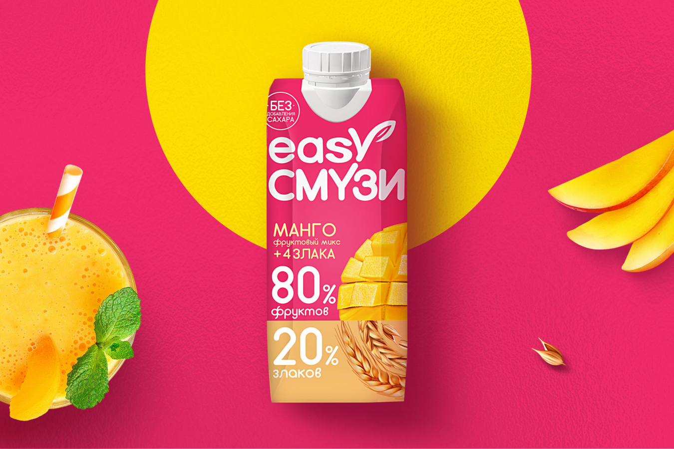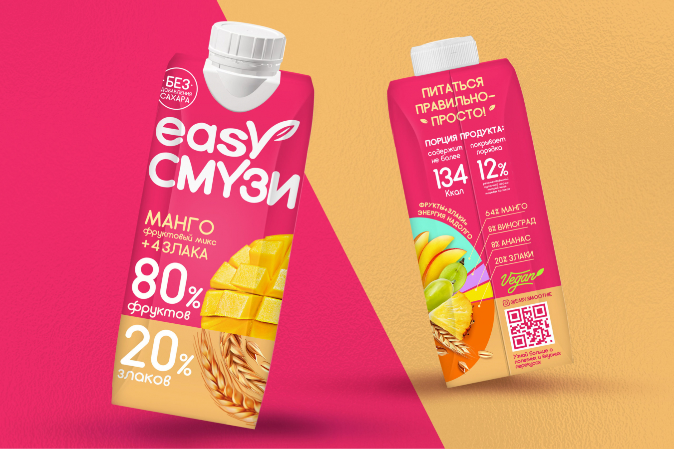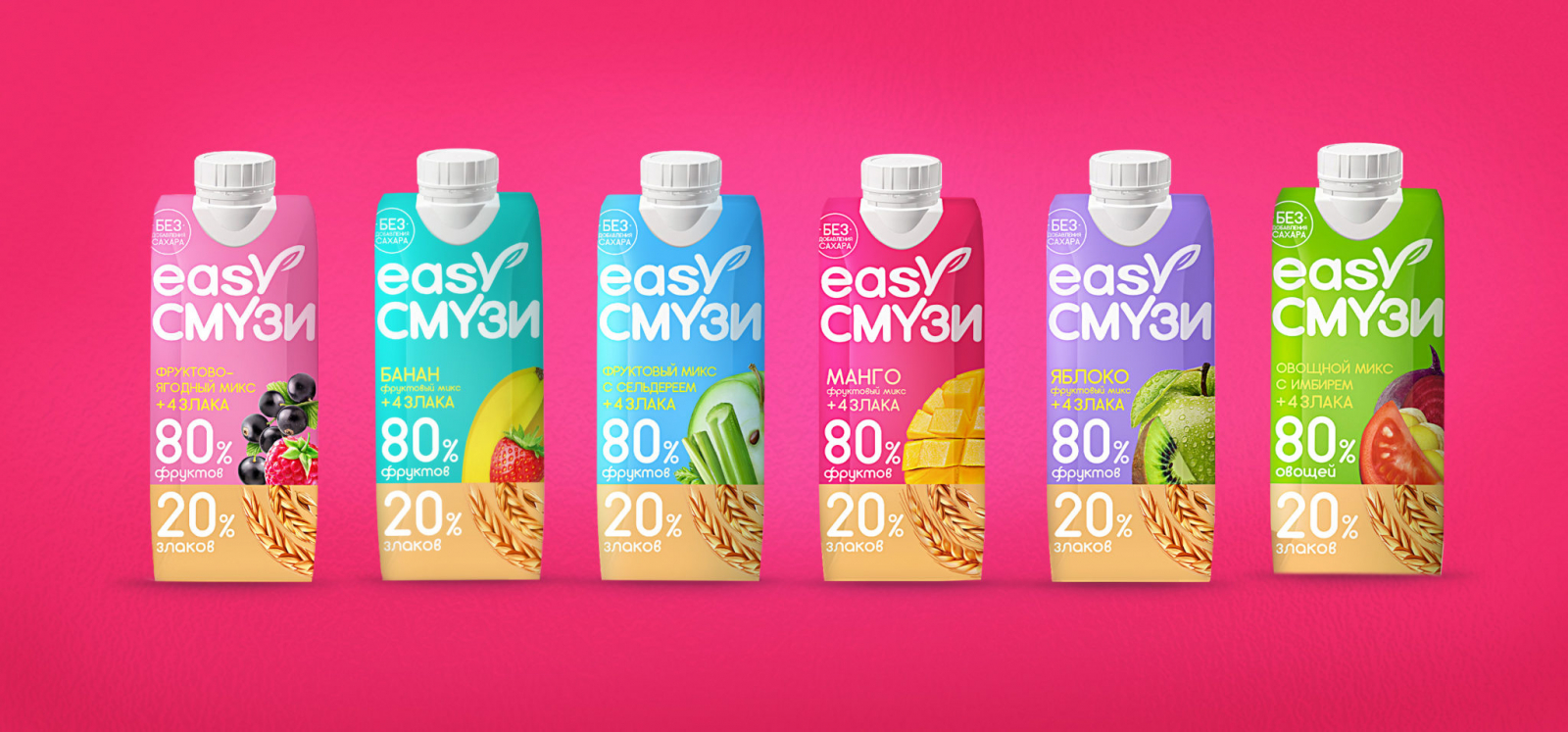 В 2015 в агентстве разработали дизайн упаковки для бренда Easy Смузи, полезного перекуса, состоящего на 80% из фруктов/овощей и на 20% из злаков. Но с тех пор многое изменилось, у покупателей появились новые предпочтения, поэтому производитель решил расширить ассортимент и ввести новинки с интересными ингредиентами. Дизайнерам необходимо было осуществить редизайн с учетом пожеланий со стороны клиента.