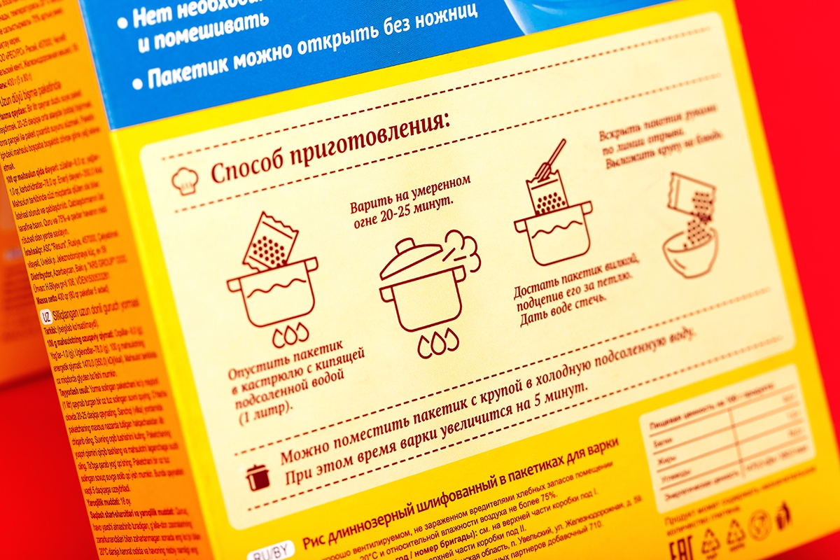 Такой рациональный подход поможет быстрее находить крупы «Настоящая хозяйка» на полке. А лаконичная инфографика поддерживает общий характер дизайна упаковки.
