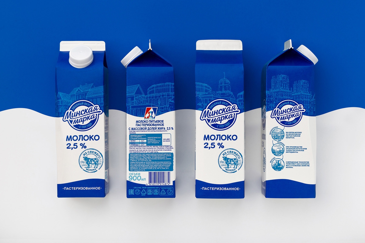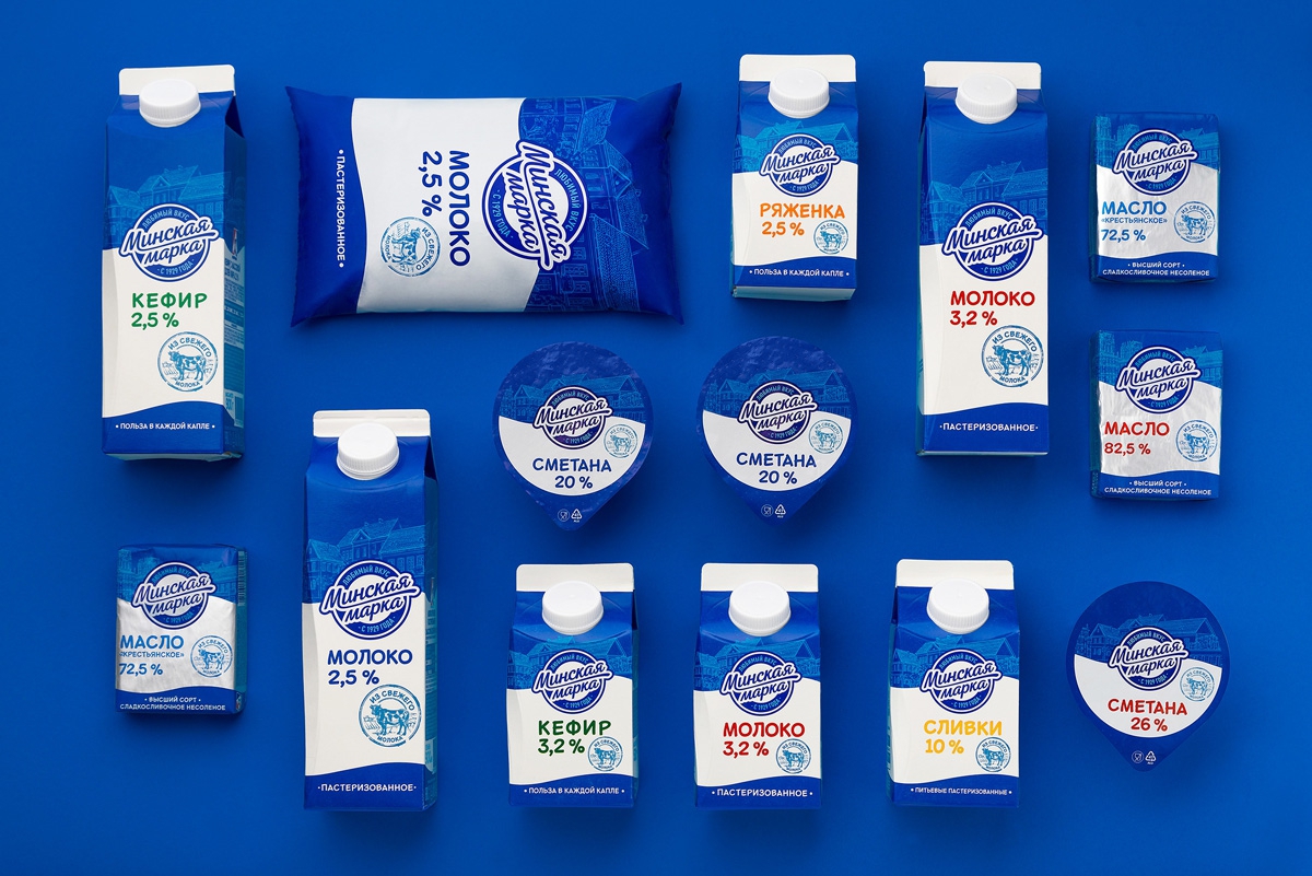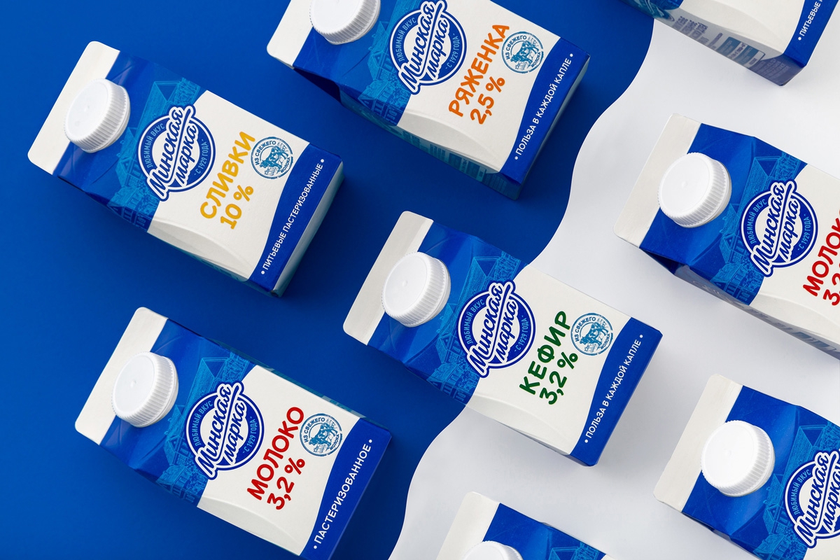 На смену целой гамме фирменных цветов пришёл один — строгий и уверенный синий, который ранее, хоть и присутствовал на упаковке, оставался без должного внимания. Сочетание белого и синего — это, по словам дизайнеров, уверенное решение для молочной продукции и вместе с тем отсылка к геральдическим цветам Минска.