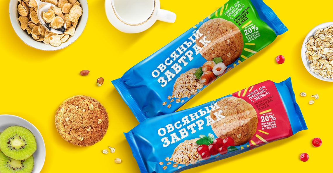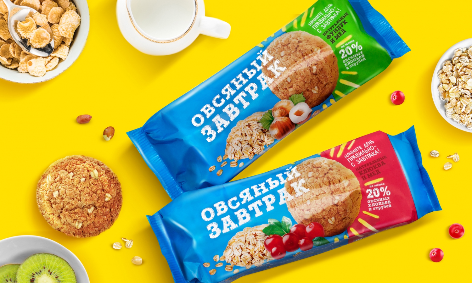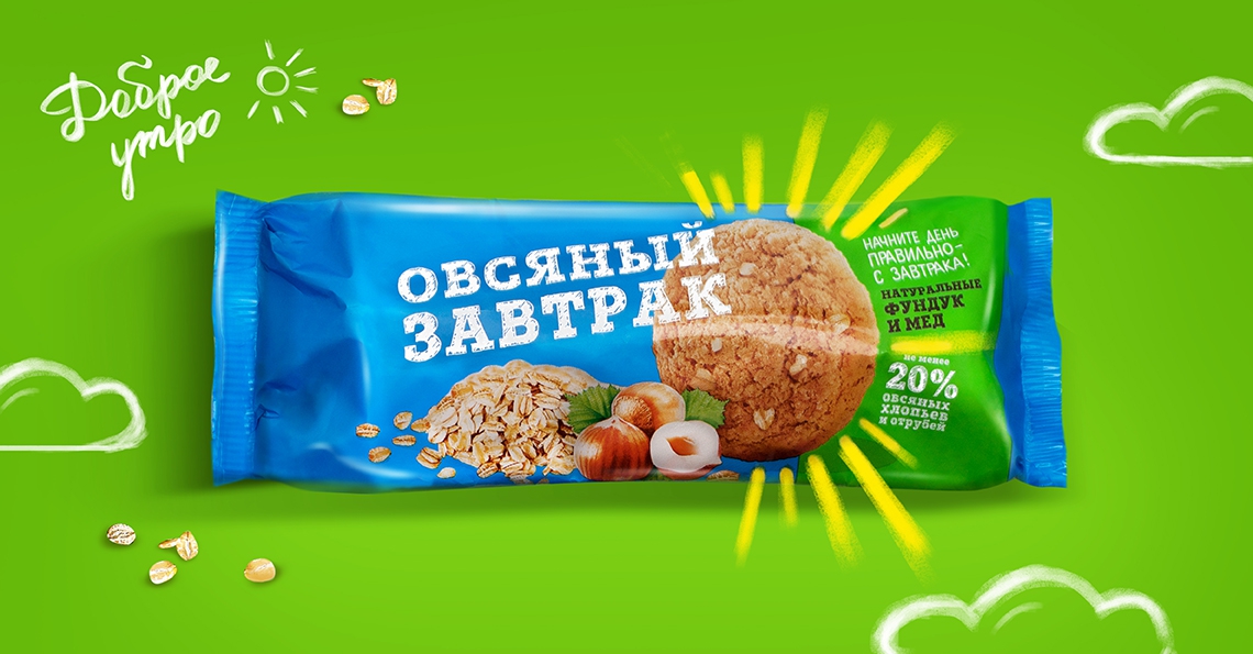 Визуальная идея состояла в изображении продукта, который заряжает всё вкруг своей энергией. Лучи солнца на ярко голубом фоне дают чёткую ассоциацию с утром. Утром не по-питерски пасмурным и сонным, а добрым, позитивным и бодрым. Для максимальной выделяемости на полке использованы контрастные локальные цвета и крупный шрифт. «Элементы «крафтовости» в стилистике как будто говорят «Этим утром ты можешь сам нарисовать свой день, каким захочешь!». Для усиления основной идеи продукта — овсяное печенье на завтрак — и формирования правильной привычки потребления на упаковке располагается простая коммуникация — «Начните день правильно — с завтрака!»