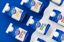 Белый цвет был и остается классикой для молочной упаковки, вызывающей ассоциацию чистоты и ощущение свежести. Синий риббон на белом фоне стал контрастным решением для привлечения внимания покупателя.