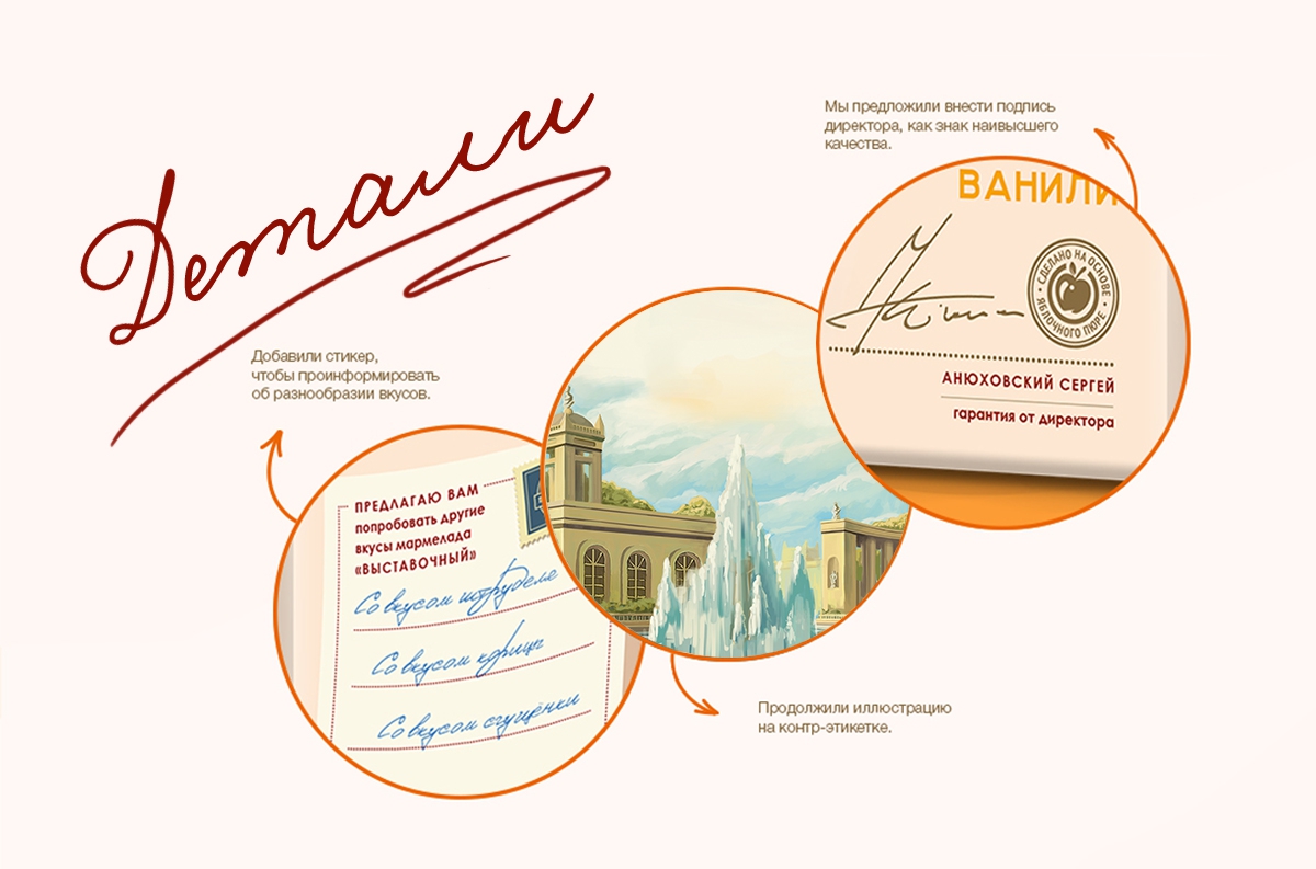 Линейка мармелада отличается большим разнообразием вкусов — как классических, так и новых. Чтобы подчеркнуть это разнообразие, с обратной стороны был добавлен крафтовый стикер, предлагающий потребителям попробовать и другие виды мармелада.