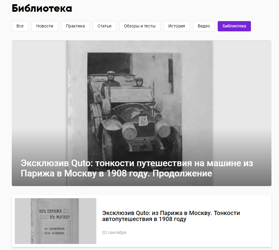 В «Библиотеке» на сайте Quto.ru пользователям доступны самые специфические подробности: например, сколько стоили опции комфорта в машинах дореволюционной России или какими были правила дорожного движения в начале ХХ века.