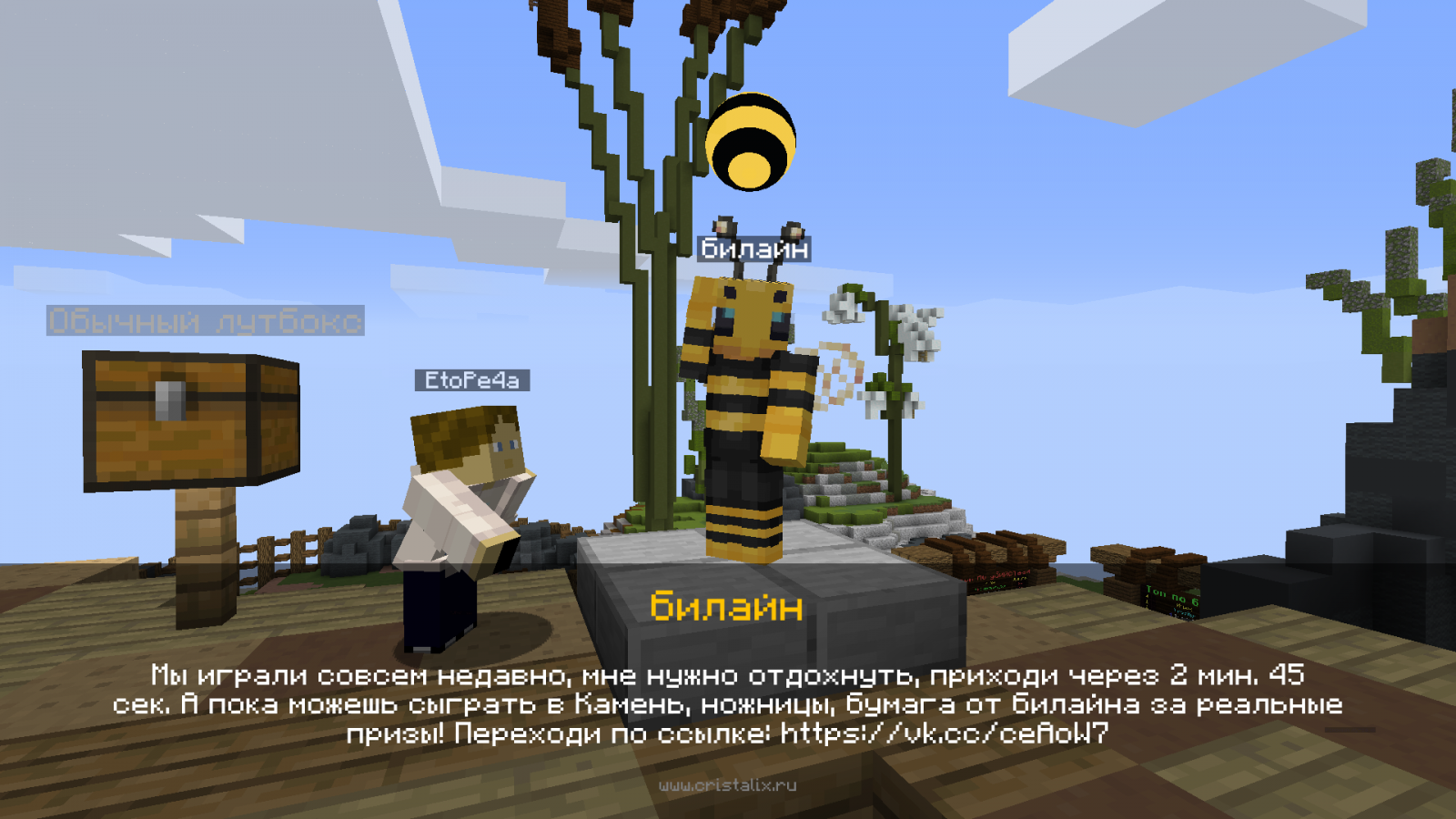 Авторы кейса интегрировали в Minecraft бота-пчелу — при входе пользователя в игру на любой из серверов Cristalix он предлагал сыграть в «Камень, ножницы, бумага». Если участник выигрывал, бот награждал его призом — забавным аксессуаром-роботом для украшения своего игрового персонажа, а также предлагал всем игрокам перейти на сайт «билайна». Подробнее на Sostav.