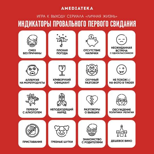 Чтобы поддержать сериал «Личная жизнь», AMEDIATEKA запустила в своем Instagram-аккаунте «игру-бинго» на тему самых неудачных первых свиданий. Подписчикам предлагалось выбрать из списка те варианты, которые случались у них в реальной жизни, и поделиться ими в комментариях или в сториз.