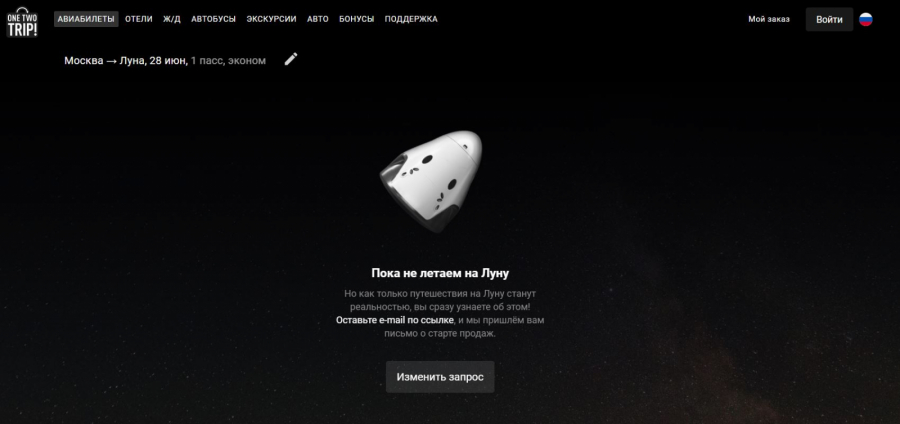 Если выбрать название планеты или спутника в разделе поиска авиабилетов, сервис предложит клиенту оставить свой email, чтобы первым узнать о начале коммерческих полётов.
