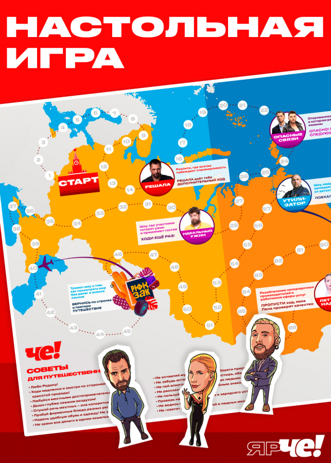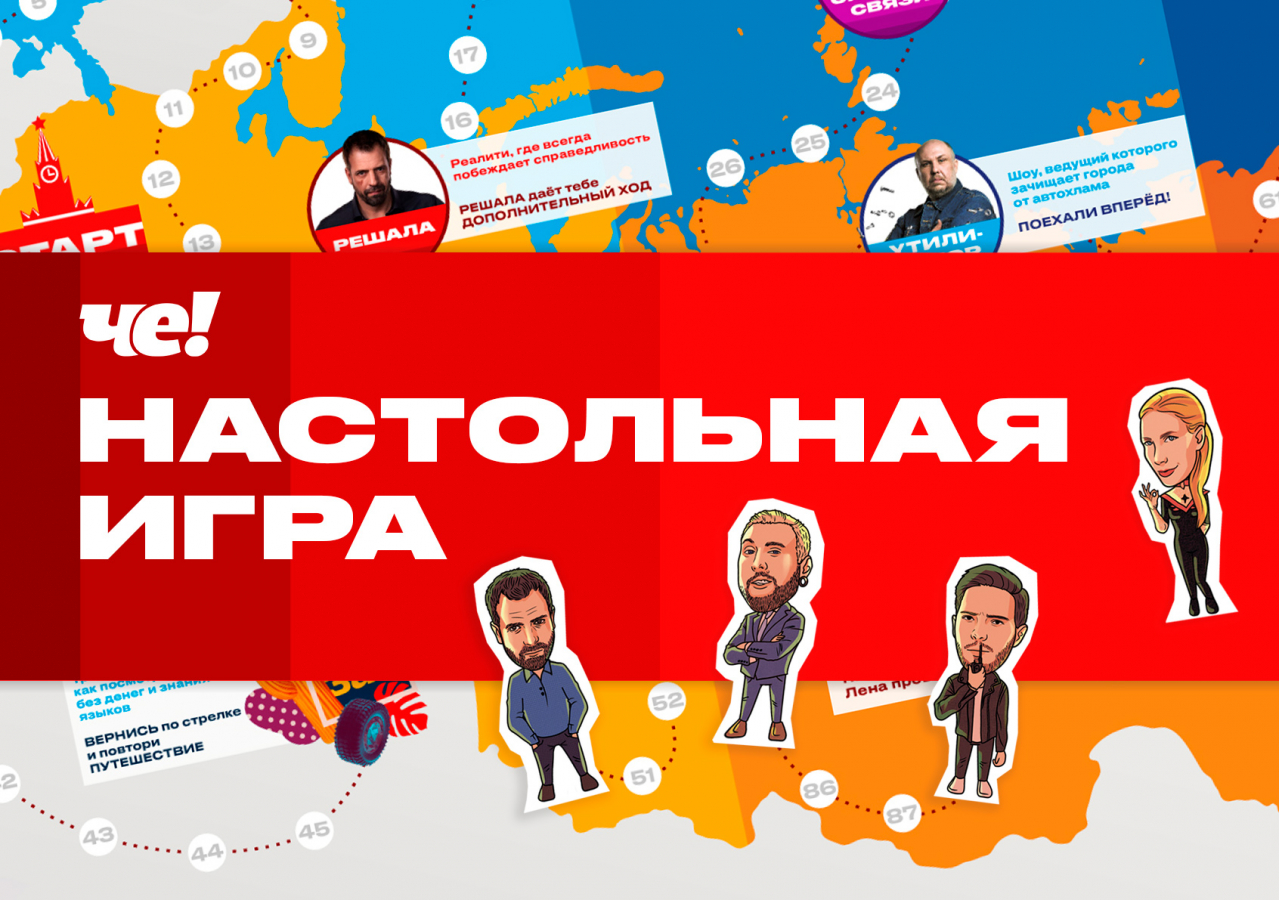 Ко Дню России «ЧЕ!» создал необычное признание в любви Родине — настольную игру-ходилку, которая предлагает игрокам отправиться в путешествие по стране и пройти ее от Москвы до Владивостока вместе с ведущими телеканала.