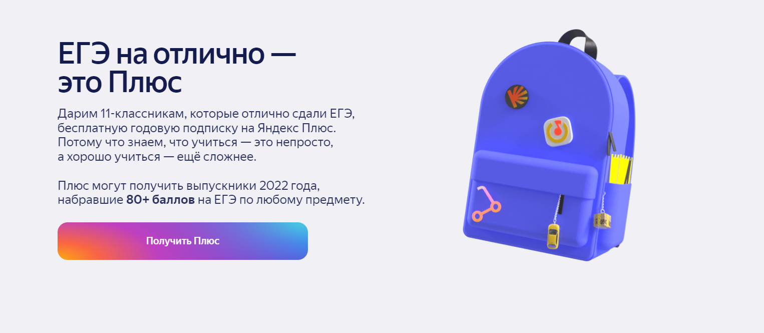 Выпускники российских школ, которые получили высокие баллы на ЕГЭ, могли получить бесплатный доступ к «Яндекс Плюс» на год. Чтобы воспользоваться предложением, достаточно было набрать от 80 баллов на ЕГЭ по любому школьному предмету.