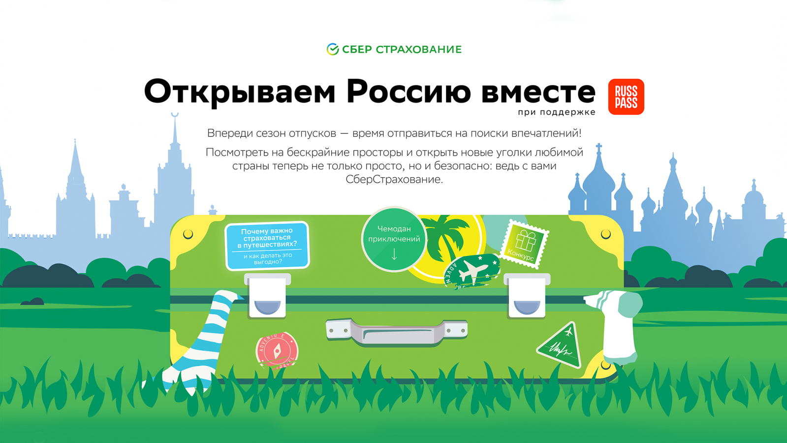 «СберСтрахование» и RUSSPASS запустили активацию для путешественников — интерактивный гид «Открываем Россию вместе». Пользователю предлагается сменить четыре часовых пояса и 10 направлений, узнать о сотне интересных мест и выбрать страховой пакет для ближайшего путешествия.