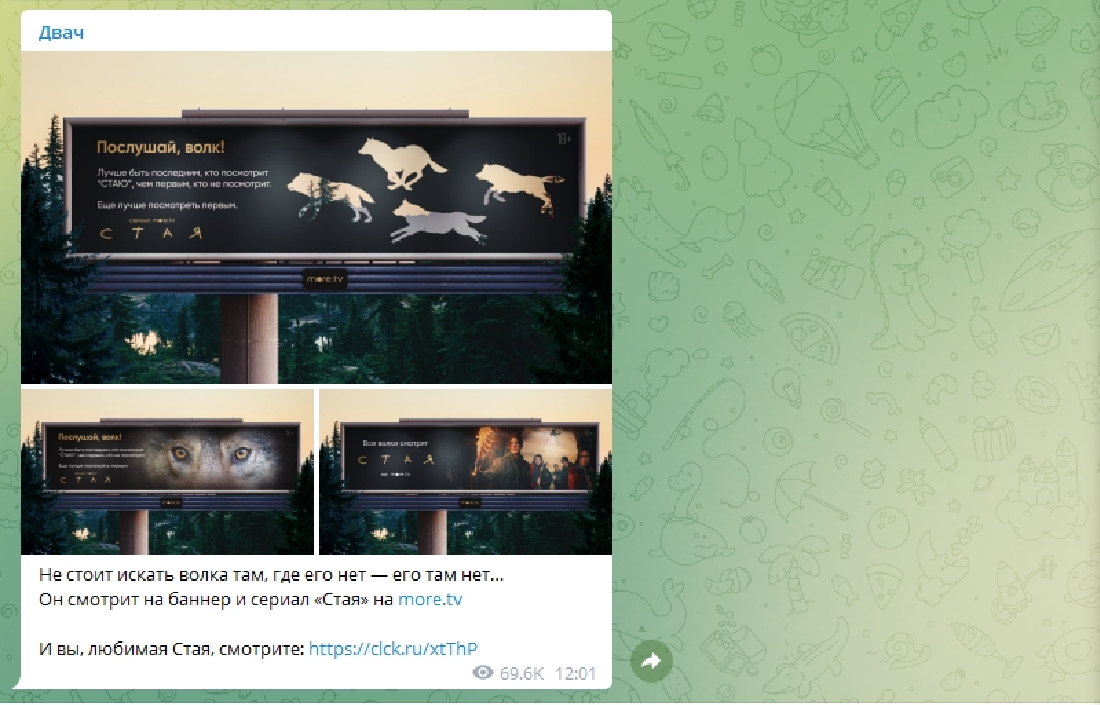 Устанавливать в лесу настоящие рекламные конструкции представители more.tv не стали, но запустить забавную новость в социальных сетях можно и без этого. Специалисты создали реалистичные изображения баннеров с цитатами от мудрых волков, затем запостили их в пабликах «ВКонтакте» и Telegram-каналах. Подробнее на Sostav.