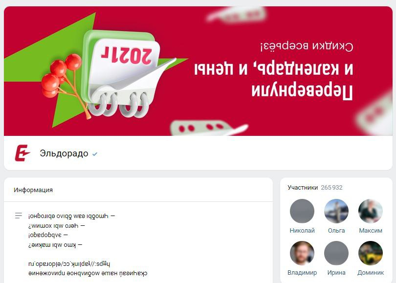 Кроме календаря, компании в прямом смысле на один день перевернули на 180 градусов контент на главной странице сайтов mvideo.ru и eldorado.ru, а также оформление в своих аккаунтах в соцсетях.