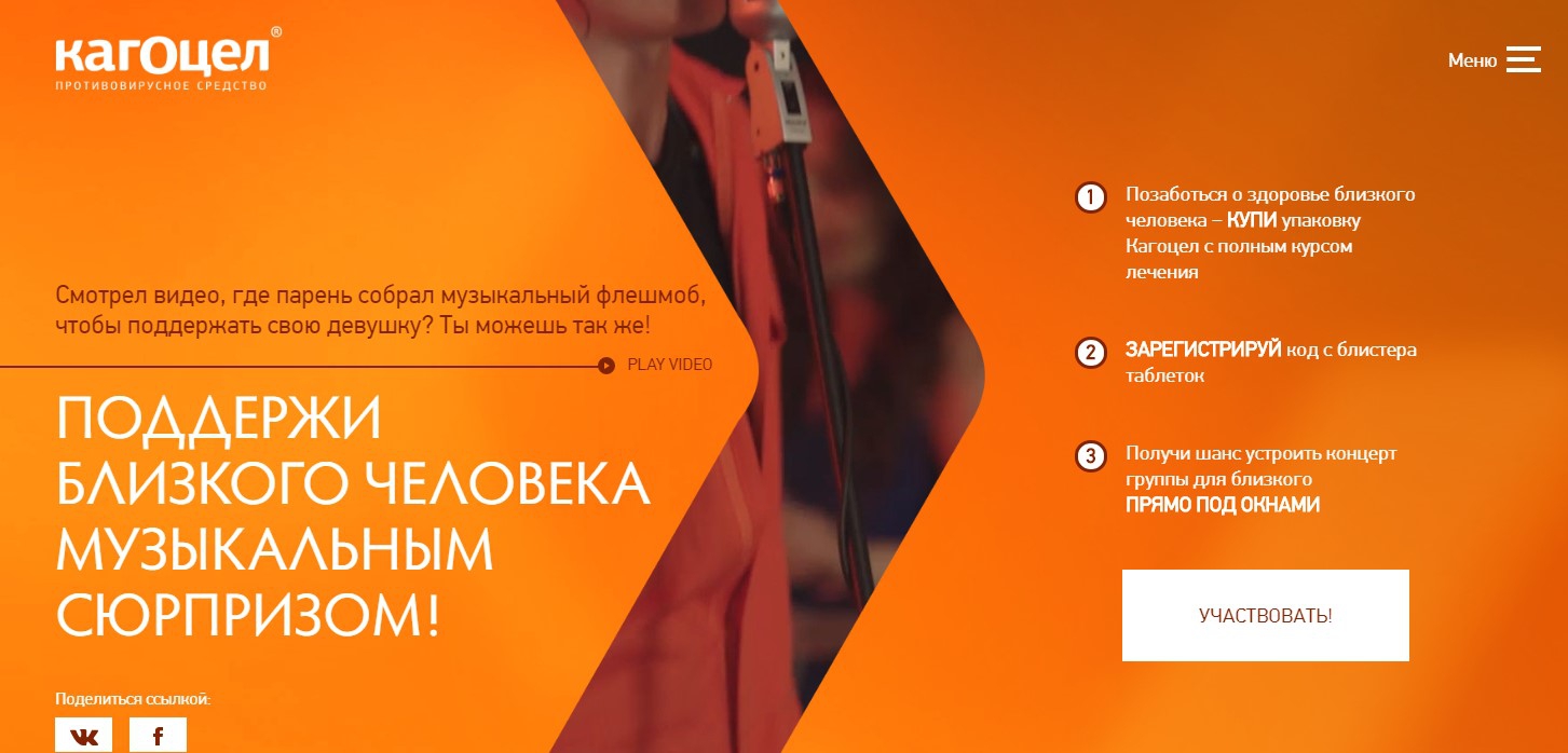 Чтобы получить шанс выиграть живое музыкальное выступление, необходимо было купить упаковку «Кагоцел» с полным курсом лечения и зарегистрировать код с блистера таблеток.