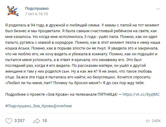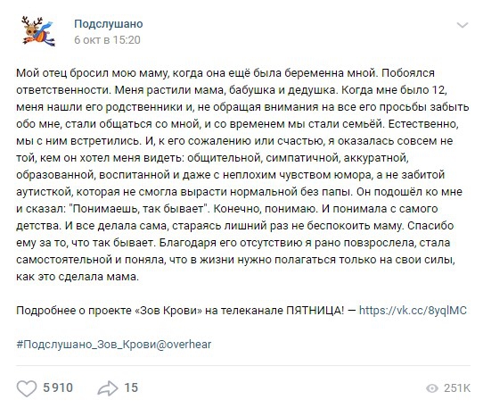 Телеканал «Пятница!» и паблик «Подслушано» Вконтакте запустили социальный флешмоб #Подслушано_Зов_Крови. Пользователи социальной сети могут анонимно поделиться историей поиска или встречи со своими родителями, которые бросили их в детстве.
