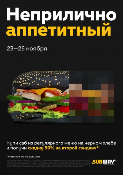 В рамках рекламной кампании была заложена механика акции «купи сэндвич из регулярного меню на черном хлебе и получи скидку 50% на второй сэндвич».