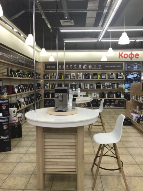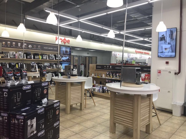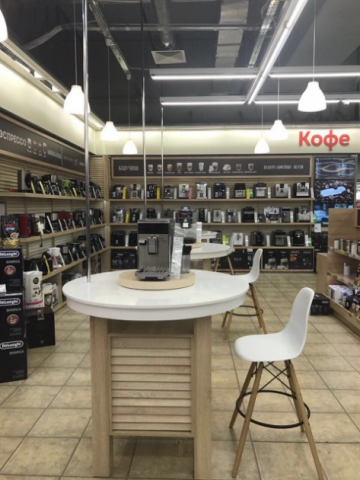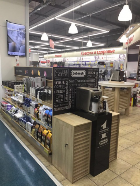 В этом году компания De'Longhi приняла решение оформить кофецентр в магазине «М.Видео», расположенном в ТЦ «Метрополис». Для реализации данного проекта была выбрана компания