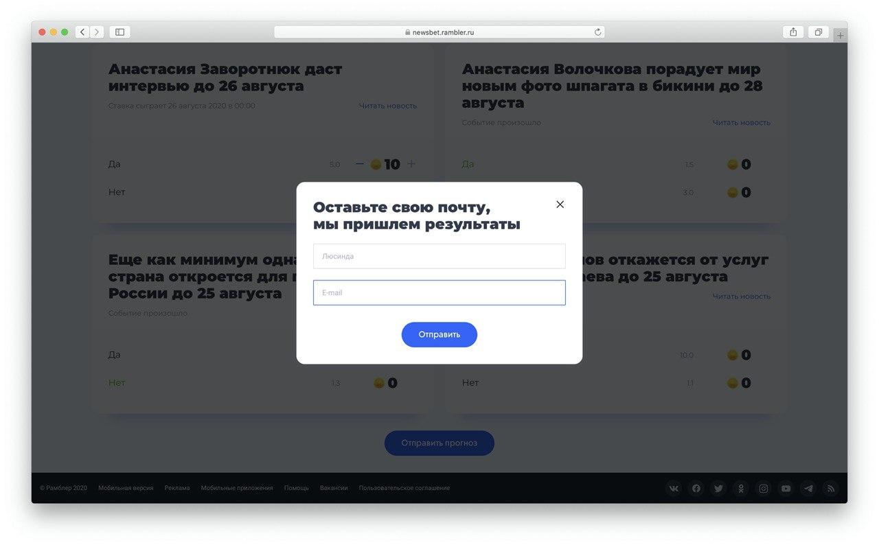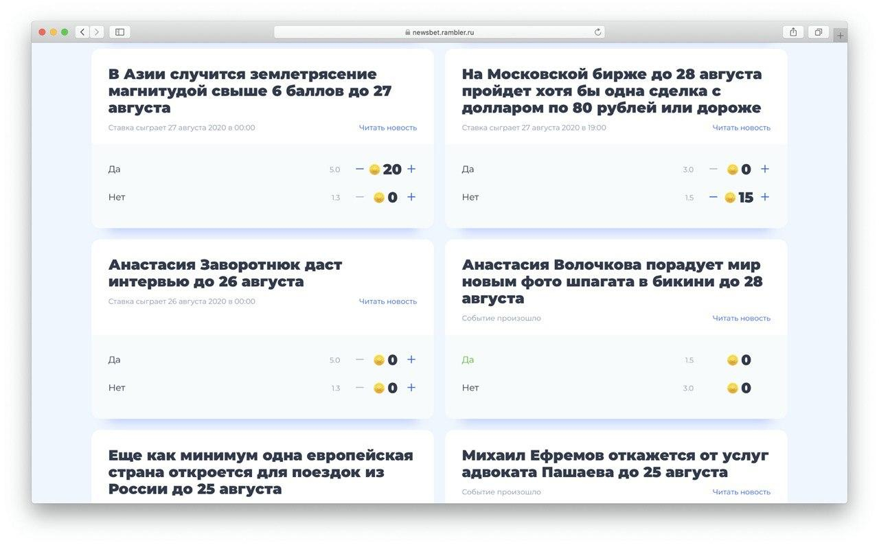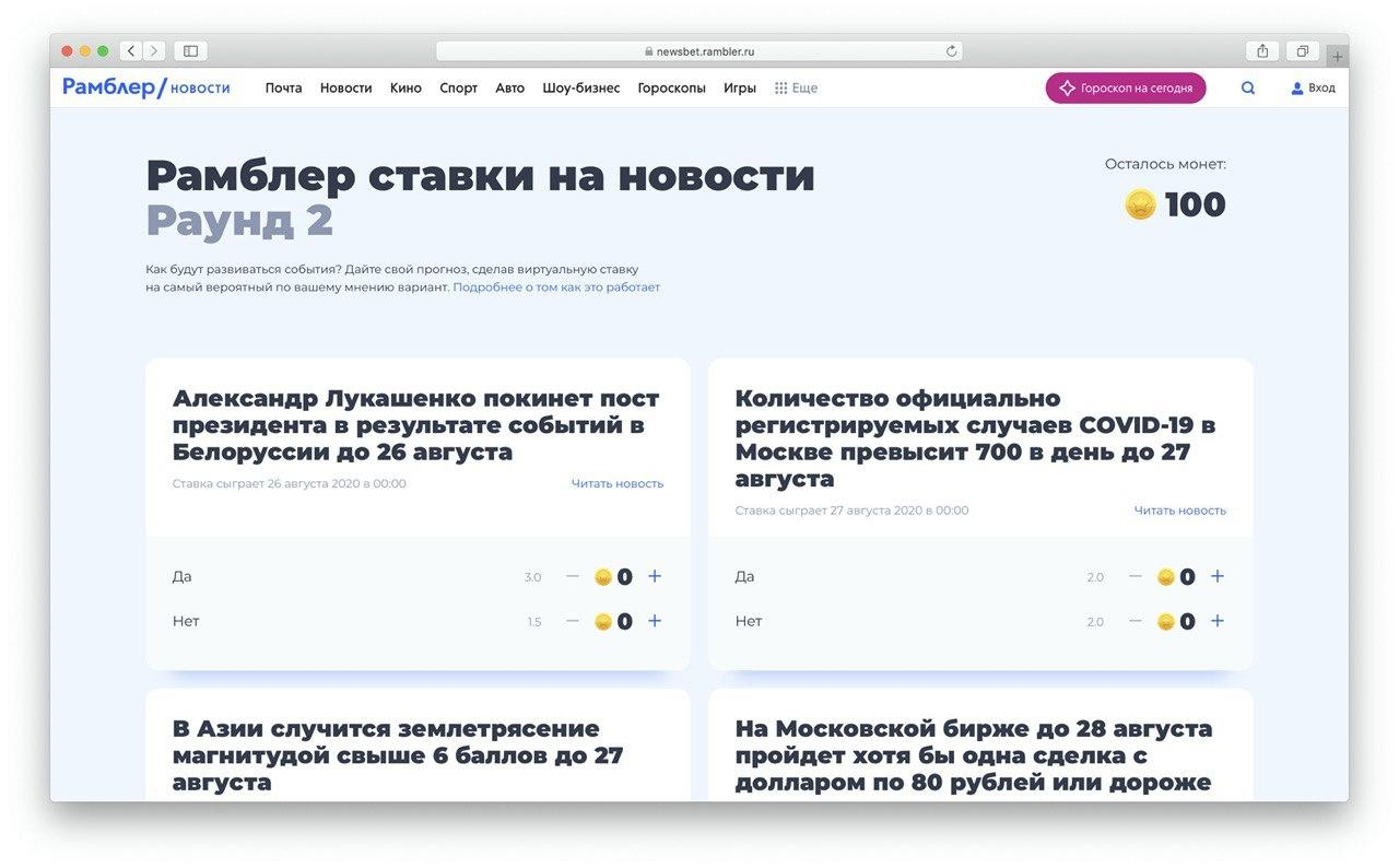 Портал «Рамблер» предложил читателям спрогнозировать исход популярных новостей. Среди актуальных тем: «Покинет ли Александр Лукашенко свой пост?», «Откажется ли Ефремов от своего адвоката?», «Порадует ли Анастасия Волочкова мир своим новым фото шпагата в бикини?». Пользователь может сделать ставку на возможный итог события — «Да» или «Нет». Монетизировать выигрыш нельзя, но можно попасть в рейтинг лучших игроков.