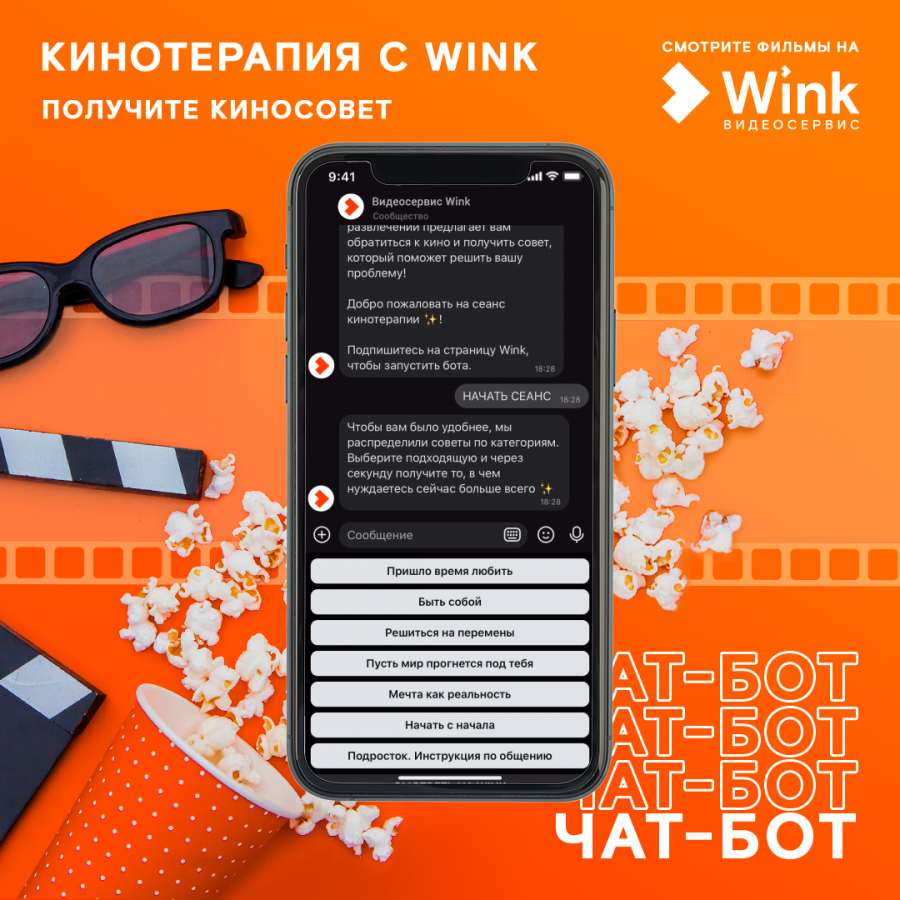 Агентство Re:evolution и видеосервис Wink от «Ростелекома» запустили интерактивного чат-бота, который предлагает пользователям фильм исходя из выбранного настроения или ситуации. Получить киносовет просто: пользователь пишет команду в личные сообщения группы и выбирает из списка тему. Узнав, что волнует собеседника, чат-бот генерирует gif с фрагментом из фильма и цитатой оттуда, а следом присылает промокод на бесплатную подписку на Wink. Подробнее на Sostav.
