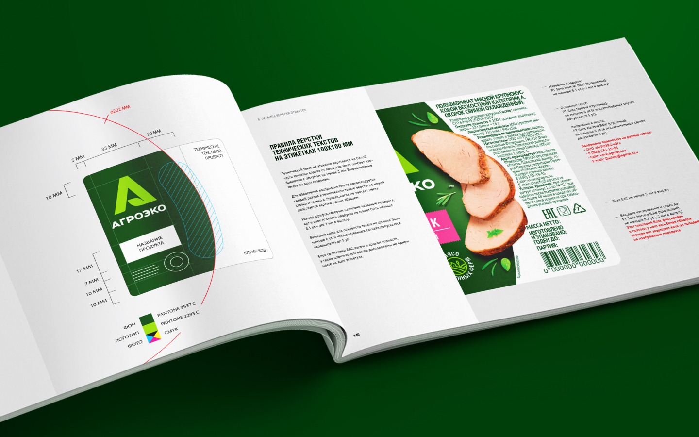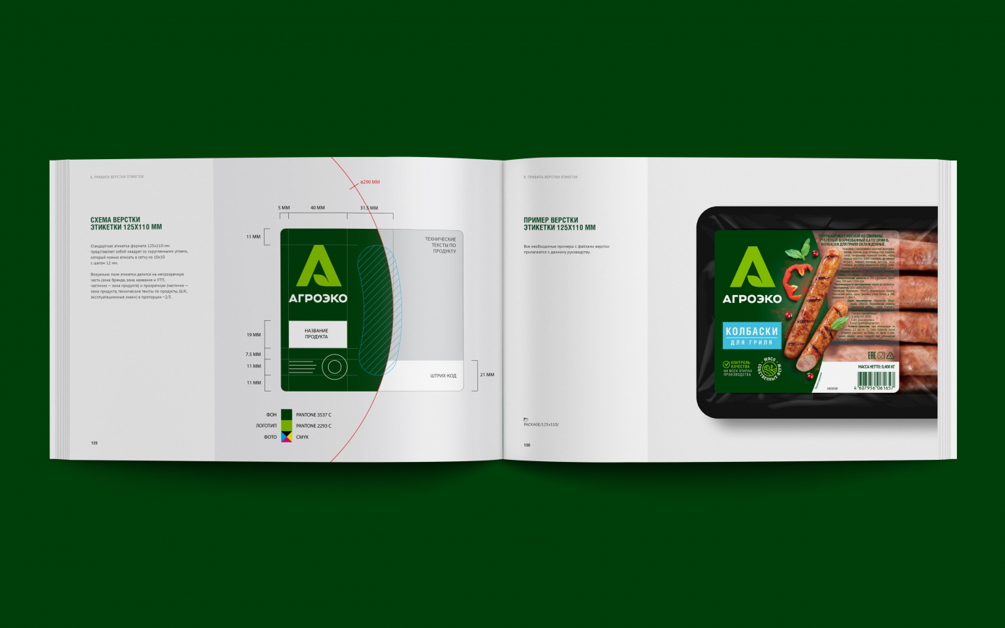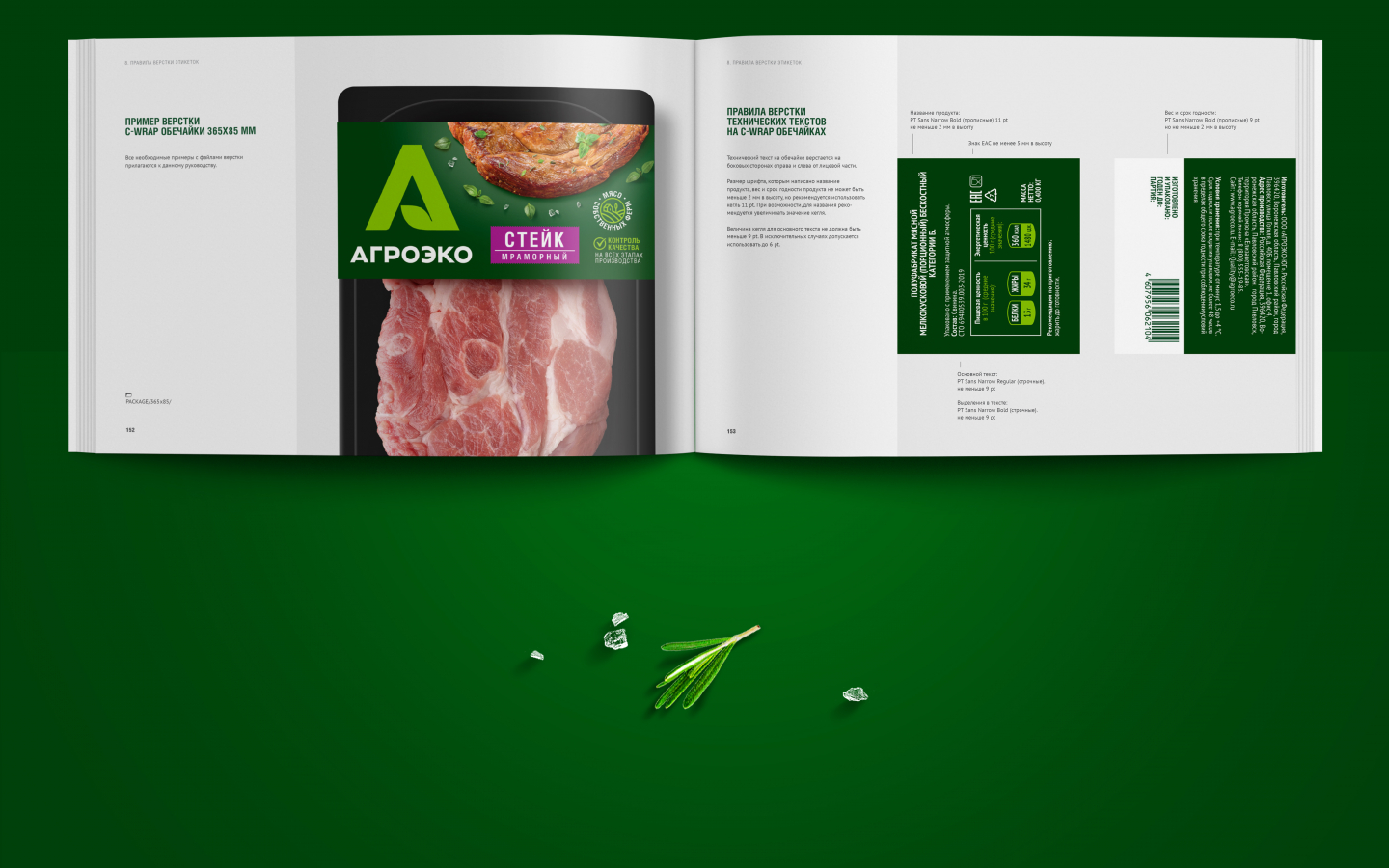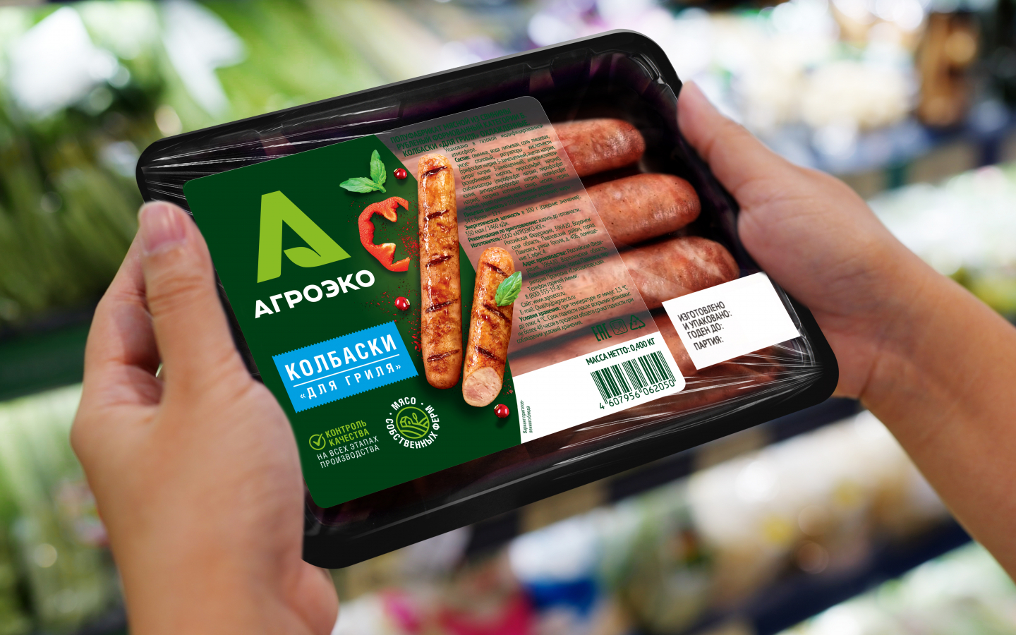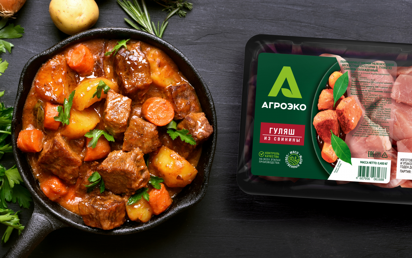 «Агроэко» — крупнейший производитель свинины в России, который на рынке с 2009 года. В редизайне использованы два типа стикеров: непрозрачные для базовой продукции (фарш); на прозрачной основе для премиальной (стейки, сосиски). На стикерах расположена фуд-зона с уже готовым блюдом. Цветные плашки с обозначением категории (колбаски для гриля, гуляш, окорок, стейки, котлеты на кости) добавляют контраста упаковке. В архитектуре упаковки использована выкладку по эллипсу, который расположен по вертикали справа от бренд-блока с буквой «А» и демонстрацией фуд-зоны.