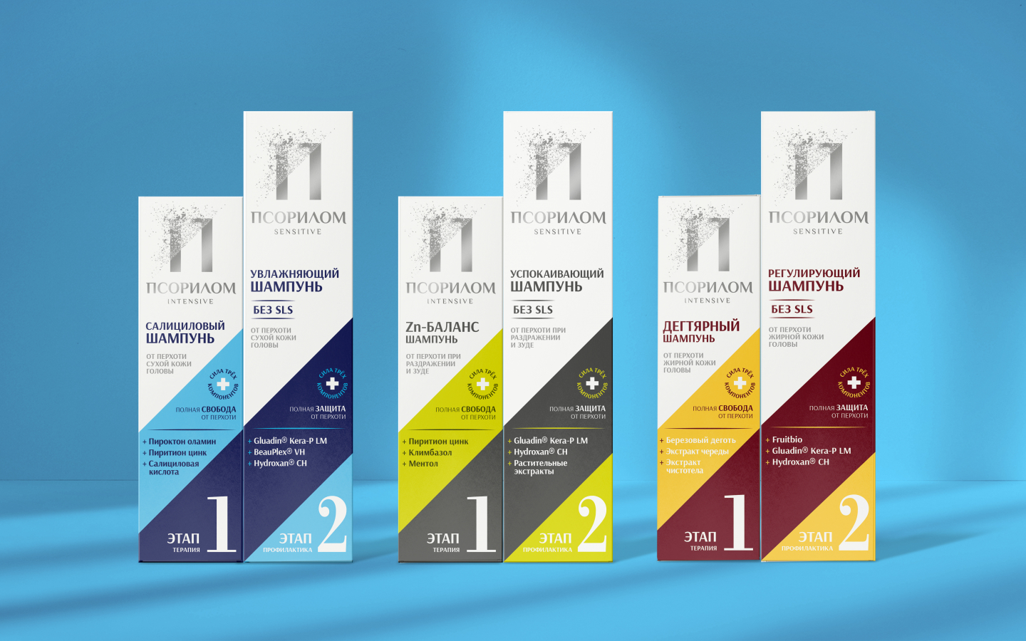 «Псорилом» — ленейка негормональных лечебно-профилактических средств для проблемной и сухой кожи. В GetBrand не стали трогать архитектуру упаковки, чтобы сохранить узнаваемость бренда для лояльных покупателей. Но сделали дизайн более современным, проработали геометрические элементы, сделали их ярче и дали им больше пространства на упаковке. На них размещена информация о свойствах продукта и УТП бренда.