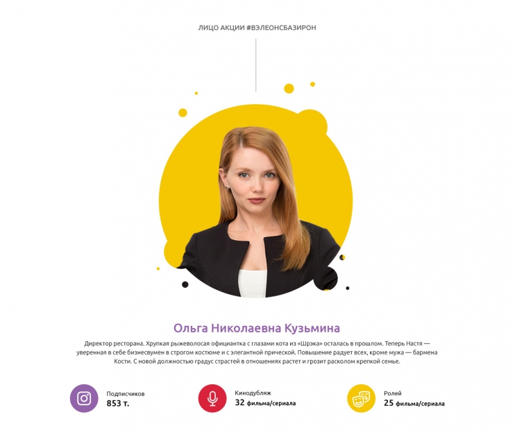 Командой агентства был разработан веселый и динамичный промосайт с уникальной анимацией на основе фотографий актрисы Ольгой Кузьминой.