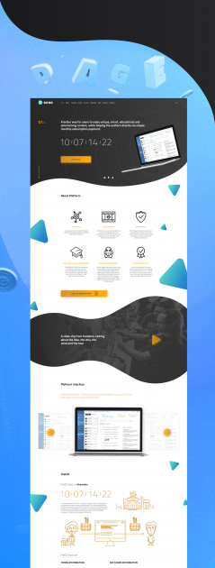 Иными словами — максимально отдалить пользователя от мысли что это очередной «фейк». Исходя из этого, был разработан «плавный» дизайн, где один информационный блок перетекает в другой, вовлекая пользователя в новый криптомир. Чёрный и белый фон- строго, стильно, но нужно было вызвать положительные эмоции, чувство «безопасности», поэтому в дизайн добавили графические элементы в синих оттенках и оранжевый акцент на кнопки заголовков.