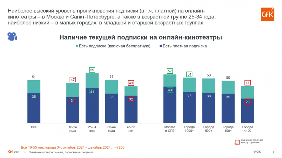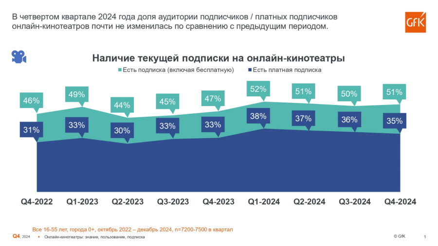 В четвертом квартале 2024 года подписками на онлайн-кинотеатры пользовался 51% жителей российских городов. Показатель впервые превысил 50% в начале прошлого года и оставался стабилен на протяжении 12 месяцев, колеблясь от 50 до 52% в отдельные кварталы. Об этом Sostav рассказали в исследовательской компании GfK.