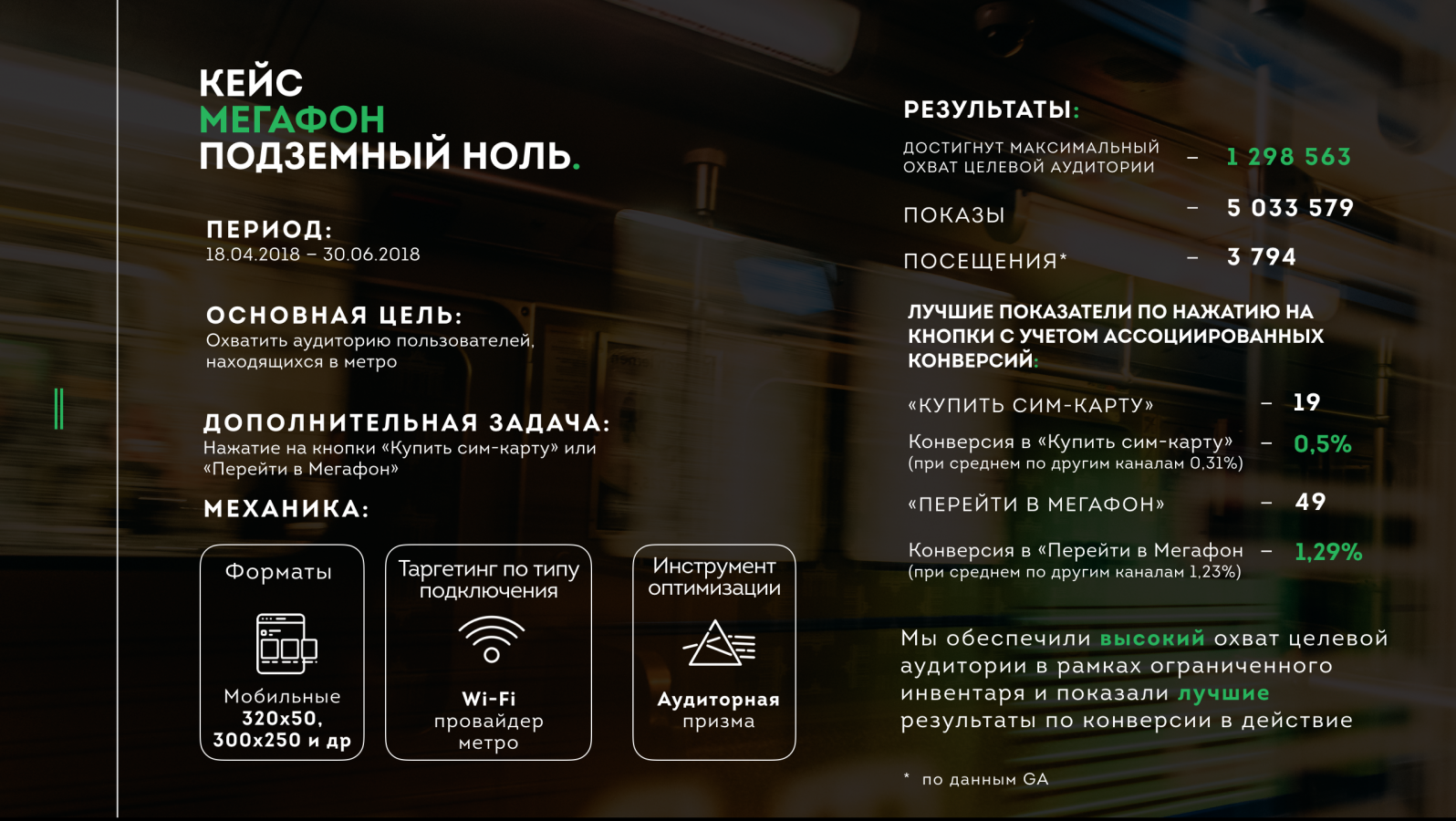 Компания МегаФон анонсировала акцию «Подземный ноль», по которой абонентам предоставляется безлимитный интернет на соцсети, мессенджеры и музыку при поездке в метро. Главная цель в рамках брифа — обеспечение максимального охвата целевой аудитории из людей, находящихся в метро. Второстепенная задача — довести до непосредственного действия: нажатия на кнопки «Купить SIM-карту» или «Перейти в МегаФон».