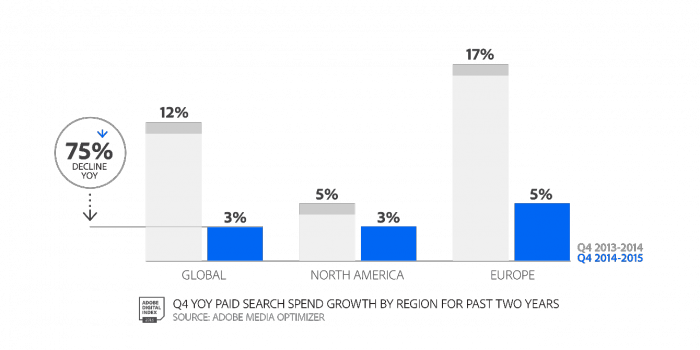 Темп роста глобальных расходов на поисковую рекламу в четвертом квартале 2015 года замедлился на 75% по сравнению с аналогичным периодом 2014 года, до 3%. В четвертом квартале 2014 года рост мировых расходов на поисковую рекламу составлял 12%.