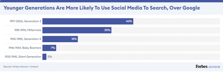 Американские зумеры (рождённые в 1997−2006 годах) используют Google для поиска информации на 25% реже, чем поколение X (1965−1980), сообщает Forbes Advisor со ссылкой на исследование Talker Research. Для этой цели молодое поколение выбирает социальные сети, такие как TikTok и Instagram* (запрещённая в России соцсеть; принадлежит Meta, которая признана экстремистской и террористической организацией). При необходимости поиска к социальным сетям в первую очередь обращается 46% представителей Z и 35% миллениалов (1091−1996).