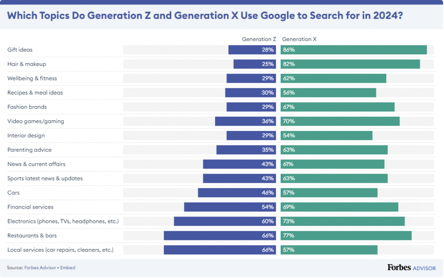 Google остается ведущей системой для поиска ресторанов и баров — для этой цели его выбирают 66% представителей Z. Следующими по популярности стали услуги, такие как ремонт автомобилей и химчистка. Они привлекают 66% зумеров. Электроника занимает третье место, её ищут в Google 60% поколения Z.