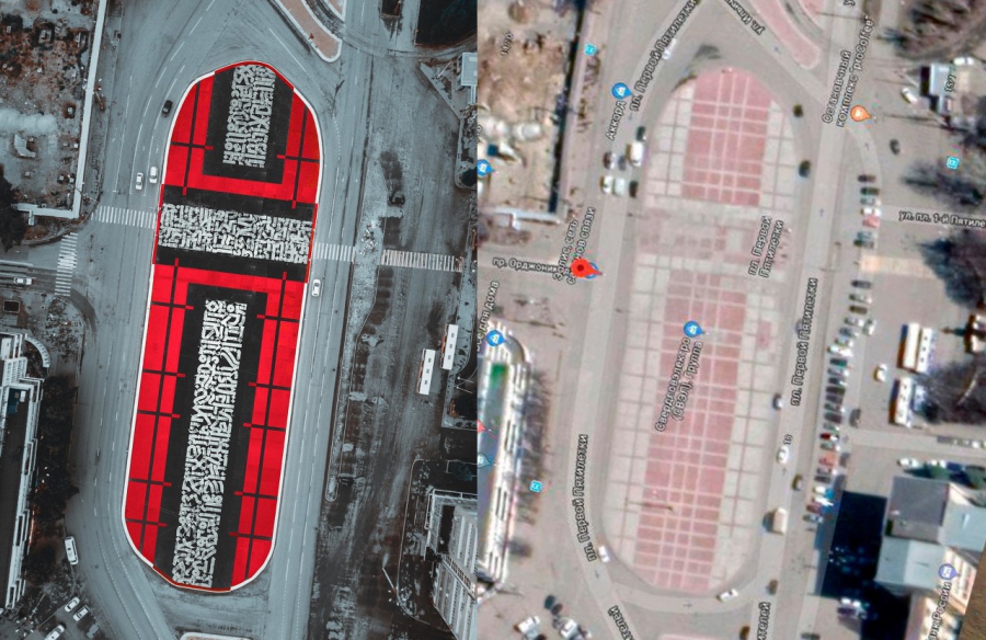 Теперь картина будет точнее повторять узор плитки на площади, а сам объект будет состоять из трех оторванных друг от друга объектов, которые выполнены с каллиграфией художника. В работе все еще используется цитата из манифеста Казимира Малевича: «Я развязал узлы мудрости и освободил сознание краски. Я преодолел невозможное и пропасти сделал своим дыханием. Мы, супрематисты, — бросаем вам дорогу».