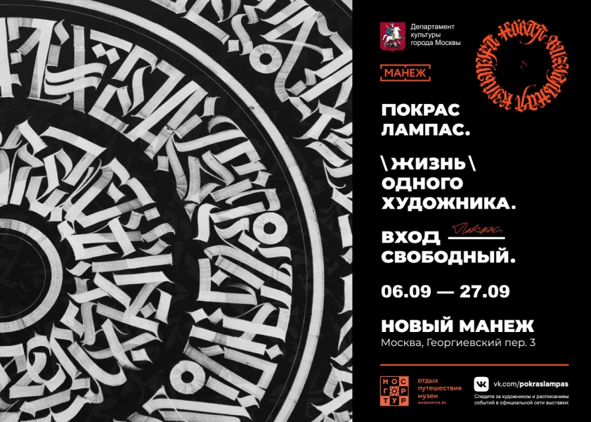 В Новом Манеже открылся первый в России выставочный проект Покраса Лампаса — основателя Calligrafuturism, одного из самых заметных и востребованных молодых художников современности. На масштабной экспозиции можно увидеть холсты автора, посмотреть на инсталляции, а также поучаствовать в непрерывном перформансе.