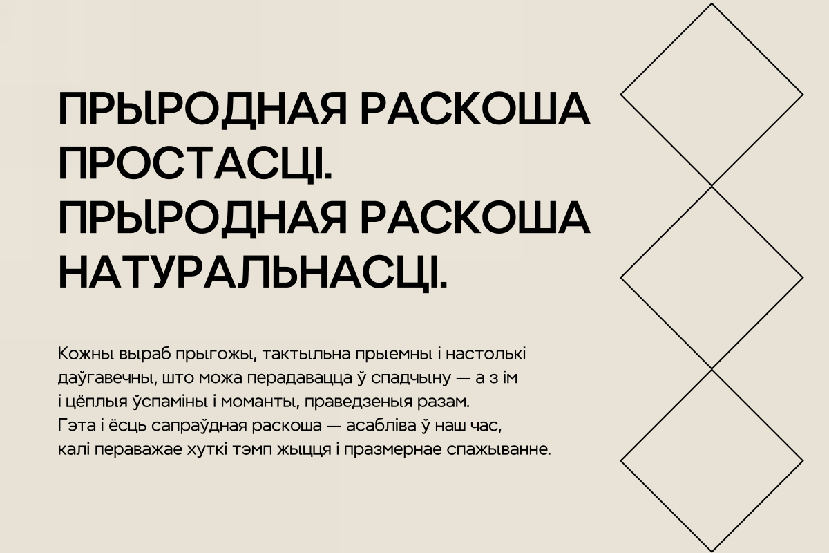 «Природная роскошь простоты. Природная роскошь натуральности» — позиционирование, презентующее национальный белорусский бренд. Лён — это материал, который не нуждается в вычурности. Он красив и роскошен сам по себе так же, как и природа, которой он обязан своим происхождением.