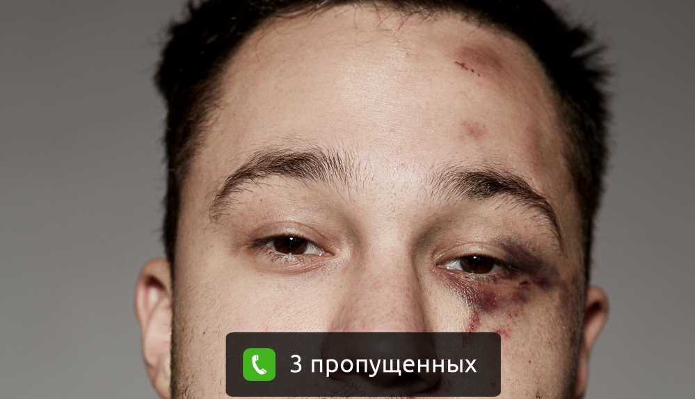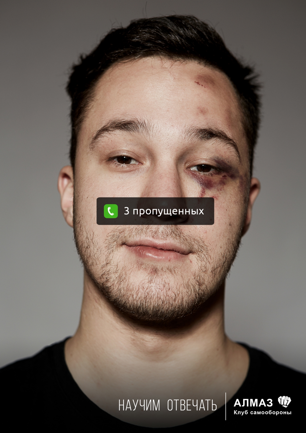 Принт представляет собой изображение лица мужчины в синяках и кровоподтеках с надписью «три пропущенных», которое отсылает к телефонным звонкам благодаря зеленой пиктограмме с телефонной трубкой. Слоганом рекламы стала фраза: «Научим отвечать».