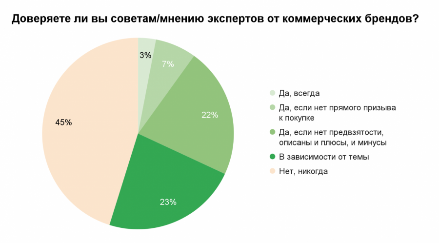 23% респондентов согласны прислушиваться к спикерам от коммерческих брендов в зависимости от темы и специфики бизнеса, 22% — если в позиции нет предвзятости, описаны плюсы и минусы. 7% доверяют комментариям специалистов различных компаний тогда, когда нет прямого призыва к покупке. 3% в целом всегда готовы полагаться на точку зрения таких экспертов.