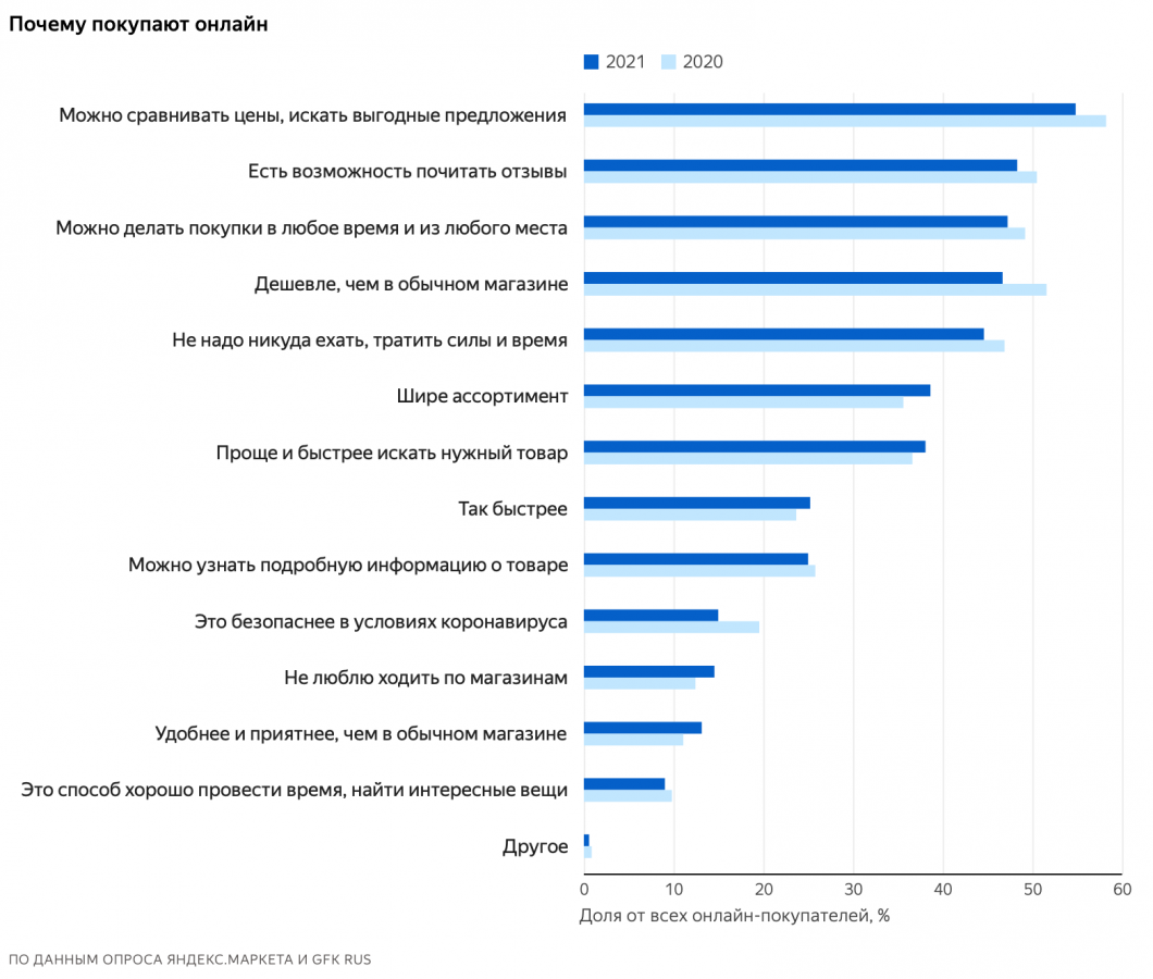 Главной причиной покупать онлайн 55 % респондентов назвали возможность сравнивать цены и искать более выгодные предложения. Каждый второй опрошенный отметил возможность почитать отзывы. Примерно так же часто респонденты указывали на сравнительно низкие цены и совершение покупок в любое время.