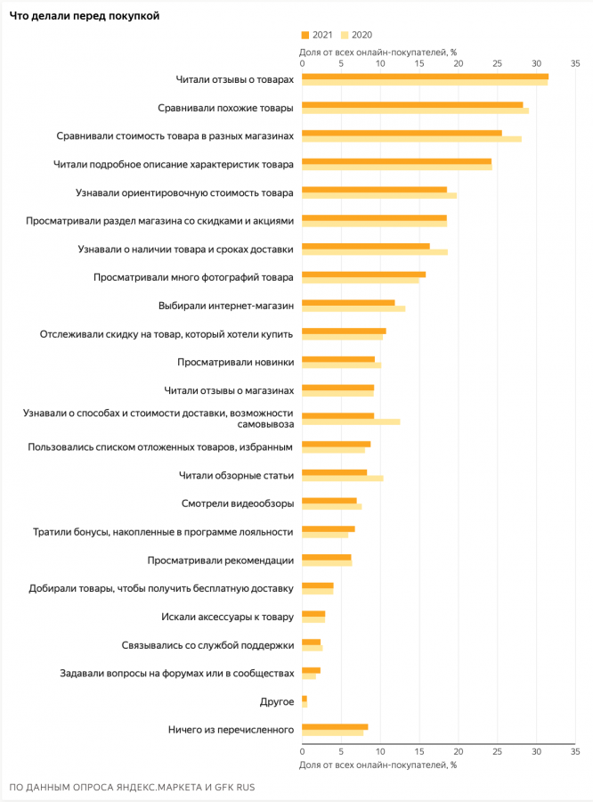 Среди действий, которые совершают перед покупкой, 32% респондентов назвали чтение отзывов, 28 % сравнивают похожие товары, а 26 % опрошенных изучают цены на них в разных магазинах.